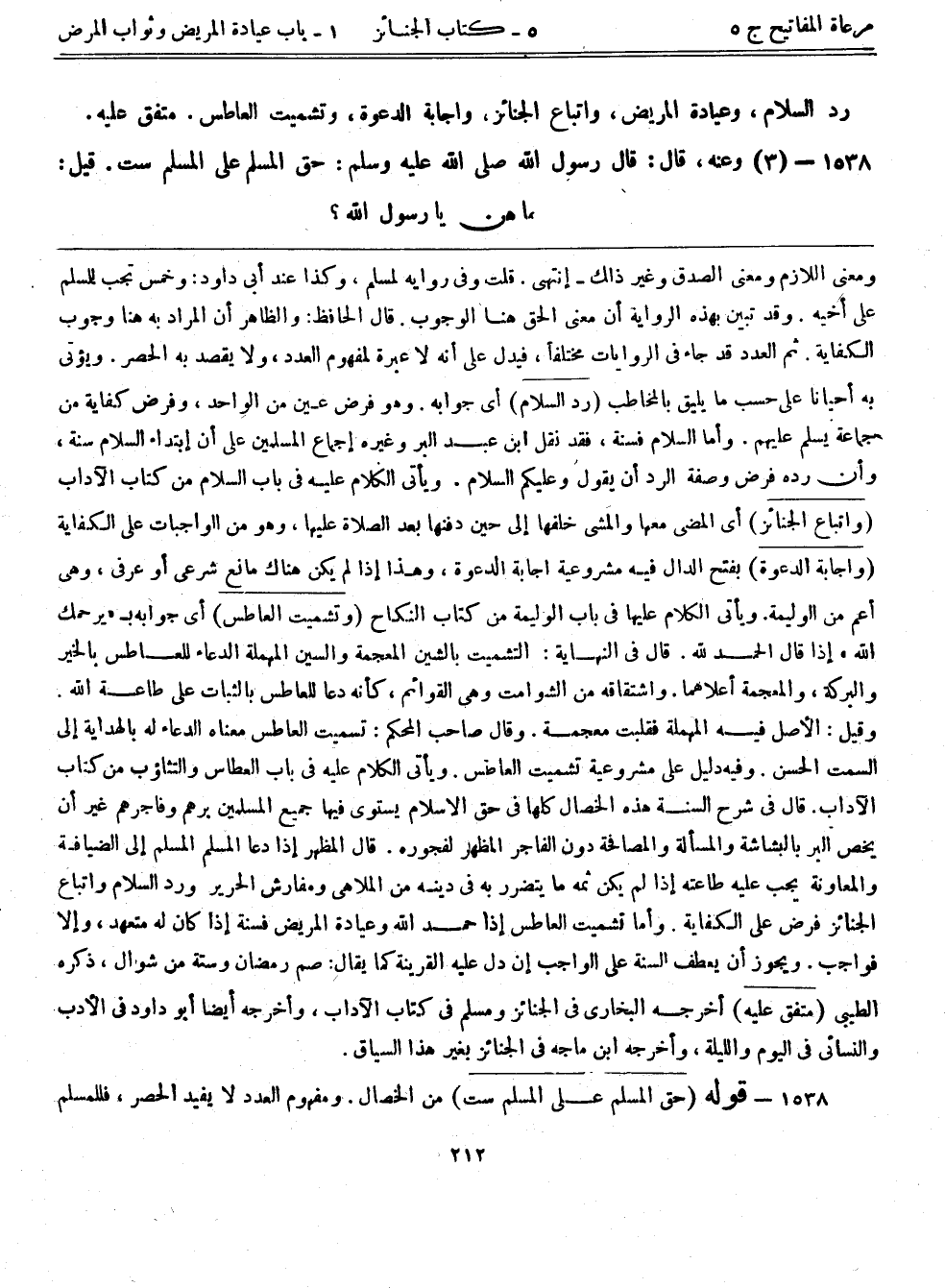 ومعنى اللازم ومعنى الصدق وغير ذلك- انتهى. قلت وفي رواية لمسلم، وكذا عند أبي داود: وخمس تجب للمسلم على أخيه. وقد تبين بهذه الرواية أن معنى الحق هنا الوجوب. قال الحافظ: والظاهر أن المراد به هنا وجوب الكفاية. ثم العدد قد جاء في الروايات مختلفاً، فيدل على أنه لا عبرة لمفهوم العدد، ولا يقصد به الحصر. ويؤتي به أحياناً على حسب ما يليق بالمخاطب (رد السلام) أي جوابه. وهو فرض عين من الواحد، وفرض كفاية من جماعة يسلم عليهم. وأما السلام فسنة، فقد نقل ابن عبد البر وغيره إجماع المسلمين على أن ابتداء السلام سنة، وأن رده فرض وصفة الرد أن يقول وعليكم السلام. ويأتي الكلام عليه في باب السلام من كتاب الآداب (واتباع الجنائز) أي المضي معها والمشي خلفها إلى حين دفنها بعد الصلاة عليها، وهو من الواجبات على الكفاية (وإجابة الدعوة) بفتح الدال فيه مشروعية إجابة الدعوة، وهذا إذا لم يكن هناك مانع شرعي أو عرفي، وهي أعم من الوليمة. ويأتي الكلام عليها في باب الوليمة من كتاب النكاح (وتشميت العاطس) أي جوابه بـ "يرحمك الله" إذا قال الحمد لله. قال في النهاية: التشميت بالشين المعجمة والسين المهملة الدعاء للعاطس بالخير والبركة، والمعجمة أعلاهما. واشتقاقه من الشوامت وهي القوائم، كأنه دعاء للعاطس بالثبات على طاعة الله. وقيل: الأصل فيه المهملة فقلبت معجمة. وقال صاحب المحكم: تشميت العاطس معناه الدعاء له بالهداية إلى السمت الحسن. وفيه دليل على مشروعية تشميت العاطس. ويأتي الكلام عليه في باب العطاس والتثاؤب من كتاب الآداب. قال في شرح السنة هذه الخصال كلها في حق الإسلام يستوي فيها جميع المسلمين برهم وفاجرهم غير أن يخص البر بالبشاشة والمسألة والمصافحة دون الفاجر المظهر لفجوره. قال المظهر: إذا دعا المسلم المسلم إلى الضيافة والمعاونة يجب عليه طاعته إذا لم يكن ثمة ما يتضرر به في دينه من الملاهي ومفارش الحرير ورد السلام واتباع الجنائز فرض على الكفاية. وأما تشميت العاطس إذا حمد الله وعيادة المريض فسنة إذا كان له متعهد، وإلا فواجب. ويجوز أن يعطف السنة على الواجب إن دل عليه القرينة كما يقال: صم رمضان وستة من شوال، ذكره الطيبي (متفق عليه) أخرجه البخاري في الجنائز ومسلم في كتاب الآداب، وأخرجه أيضاً أبوداود في الأدب والنسائي في اليوم والليلة، وأخرجه ابن ماجه في الجنائز بغير هذا السياق.