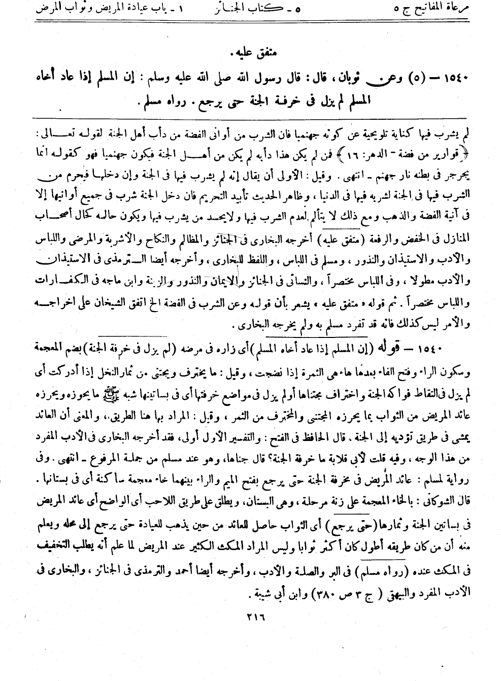 1540- قوله: (إن المسلم إذا عاد أخاه المسلم) أي زاره في مرضه (لم يزل في خرفة الجنة) بضم المعجمة وسكون الراء وفتح الفاء بعدها هاء هي الثمرة إذا نضجت، وقيل: ما يخترف ويجتنى من ثمار النخيل إذا أدركت أي لم يزل في التقاط فواكه الجنة واختراف مجتناها أو لم يزل في مواضع خرفتها أي في بساتينها شبه - صلى الله عليه وسلم - ما يحوزه ويحرزه عائد المريض من الثواب بما يحرزه المجتنى والمخترف من الثمر، وقيل: المراد بها هنا الطريق، والمعنى أن العائد يمشي في طريق تؤديه إلى الجنة. قال الحافظ في الفتح: والتفسير الأول أولى، فقد أخرجه البخاري في الأدب المفرد من هذا الوجه، وفيه قلت لأبي قلابة ما خرفة الجنة؟ قال جناها، وهو عند مسلم من جملة المرفوع- انتهى. وفي رواية لمسلم: عائد المريض في مخرفة الجنة حتى يرجع بفتح الميم والراء بينهما خاء معجمة ساكنة أي في بستانها. قال الشوكاني: بالخاء المعجمة على زنة مرحلة، وهي البستان، ويطلق على طريق اللاحب أي الواضح أي عائد المريض في بساتين الجنة وثمارها (حتى يرجع) أي الثواب حاصل للعائد من حين يذهب للعيادة حتى يرجع إلى محله ويعلم منه أن من كان طريقه أطول كان أكثر ثواباً وليس المراد المكث الكثير عند المريض لما علم أنه يطلب التخفيف في المكث عنده (رواه مسلم) في البر والصلة والأدب، وأخرجه أيضاً أحمد والترمذي في الجنائز، والبخاري في الأدب المفرد والبيهقي (ج3ص380) وابن أبي شيبة.