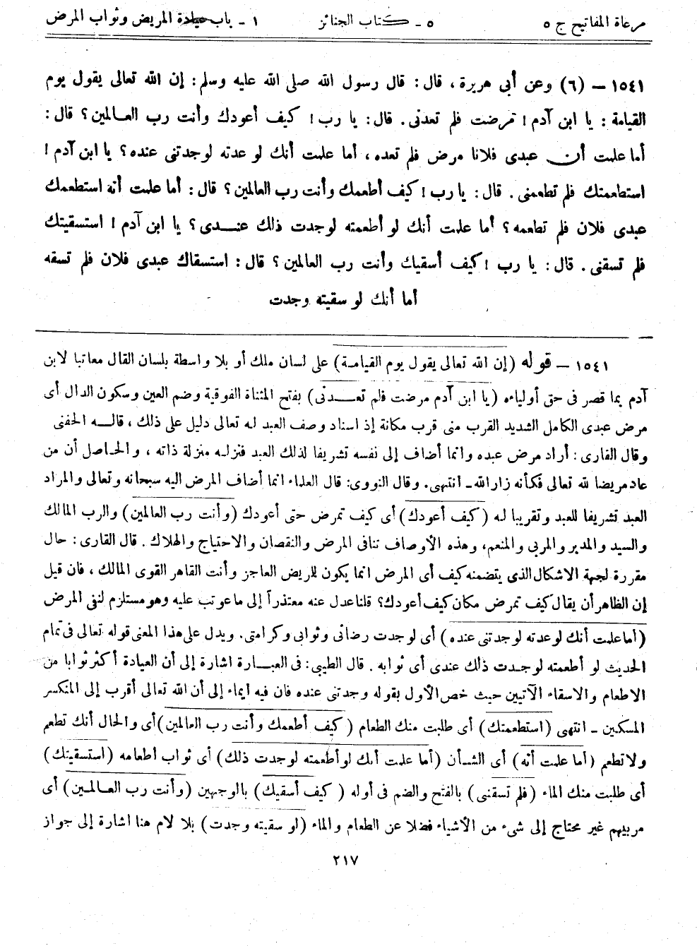 1541- قوله: (إن الله تعالى يقول يوم القيامة) على لسان ملك أو بلا واسطة بلسان القال معاتباً لابن آدم بما قصر في حق أولياؤه (يا ابن آدم مرضت فلم تعدني) بفتح المثناة الفوقية وضم العين وسكون الدال أي مرض عبدي الكامل الشديد القرب مني قرب مكانة إذ إسناد وصف العبد له تعالى دليل على ذلك، قاله الحفني وقال القاري: أراد مرض عبده وإنما أضاف إلى نفسه تشريفاً لذلك العبد فنزله منزلة ذاته، والحاصل أن من عاد مريضاً لله تعالى فكأنه زار الله- انتهى. وقال النووي: قال العلماء إنما أضاف المرض إليه سبحانه وتعالى والمراد العبد تشريفاً للعبد وتقريباً له (كيف أعودك) أي كيف تمرض حتى أعودك (وأنت رب العالمين) والرب المالك والسيد والمدبر والمربي والمنعم، وهذه الأوصاف تنافي المرض والنقصان والاحتياج والهلاك. قال القاري: حال مقررة لجهة الإشكال الذي يتضمنه كيف أي المرض إنما يكون للمريض العاجز وأنت القاهر القوي المالك، فإن قيل إن الظاهر أن يقال كيف تمرض مكان كيف أعودك؟ قلنا عدل عنه معتذراً إلى ما عوتب عليه وهو مستلزم لنفي المرض (أما علمت أنك لو عدته لوجدتني عنده) أي لوجدت رضائي وثوابي وكرامتي. ويدل على هذا المعنى قوله تعالى في تمام الحديث لو أطعمته لوجدت ذلك عندي أي ثوابه. قال الطيبي: في العبارة إشارة إلى أن العيادة أكثر ثواباً من الإطعام والإسقاء الآتيين حيث خص الأول بقوله لوجدتني عنده فإن فيه إيماء إلى أن الله تعالى أقرب إلى المنكسر المسكين- انتهى (استطعمتك) أي طلبت منك الطعام (كيف أطعمك وأنت رب العالمين) أي والحال أنك تطعم ولا تطعم (أما علمت أنه) أي الشأن (أما علمت أنك لو أطعمته لوجدت ذلك) أي ثواب إطعامه (استسقيتك) أي طلبت منك الماء (فلم تسقني) بالفتح والضم في أوله (كيف أسقيك) بالوجهين (وأنت رب العالمين) أي مربيهم غير محتاج إلى شيء من الأشياء فضلاً عن الطعام والماء (لو سقيته وجدت) بلا لام هنا إشارة على جواز