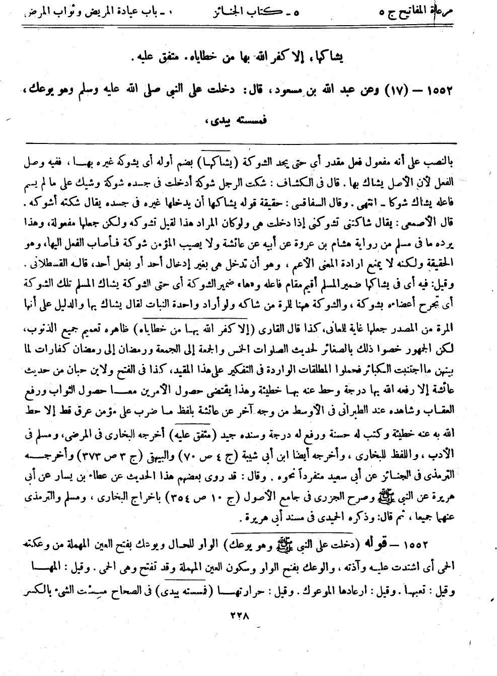 1552 - (17) وعن عبد الله بن مسعود، قال: دخلت على النبي صلى الله عليه وسلم وهو يوعك، فمسسته بيدي،