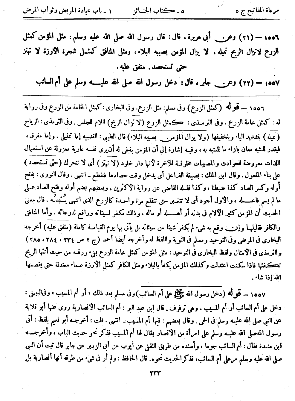 1556- قوله: (كمثل الزرع) وفي مسلم: مثل الزرع. وفي البخاري: كمثل الخامة من الزرع وفي رواية له: كمثل خامة الزرع. وفي الترمذي: كمثل الزرع (لا تزال الريح) اللام للجنس. وفي الترمذي: الرياح (تميله) بتشديد الياء وبتخفيفها (لا يزال المؤمن يصيبه البلاء) قال الطيبي: التشبيه إما تمثيلي، وإما مفرق، فيقدر للمشبه معان بإزاء ما للمشبه به، وفيه إشارة إلى أن المؤمن ينبغي له أن يرى نفسه عارية معزولة عن استعمال اللذات معروضة للحوادث والمصيبات مخلوقة للآخرة؛ لأنها دار خلود (لا تهتز) أي لا تتحرك (حتى تستحصد) على بناء المفعول. وقال ابن الملك: بصيغة الفاعل أي يدخل وقت حصادها فتقطع- انتهى. وقال النووي: بفتح أوله وكسر الصاد كذا ضبطنا، وكذا نقله القاضي عن رواية الأكثرين، وبعضهم بضم أوله وفتح الصاد على ما لم يسم فاعله، والأول أجود أي لا تتغير حتى تنقلع مرة واحدة كالزرع الذي انتهى يُبْسُه. قال معنى الحديث: أن المؤمن كثير الآلام في بدنه أو أهله أو ماله، وذلك مكفر لسيئاته ورافع لدرجاته. وأما المنافق والكافر فقليلها وإن وقع به شيء لم يكفر شيئاً من سيئاته بل يأتي بها يوم القيامة كاملة (متفق عليه) أخرجه البخاري في المرضى وفي التوحيد ومسلم في التوبة واللفظ له وأخرجه أيضاً أحمد (ج2ص234، 284، 285) والترمذي في الأمثال ولفظ البخاري في التوحيد: مثل المؤمن كمثل خامة الزرع يفيء ورقه من حيث أتتها الريح تكفئها فإذا سكنت اعتدلت وكذلك المؤمن يكفأ بالبلاء ومثل الكافر كمثل الأرزة صماء معتدلة حتى يقصمها الله إذا شاء.