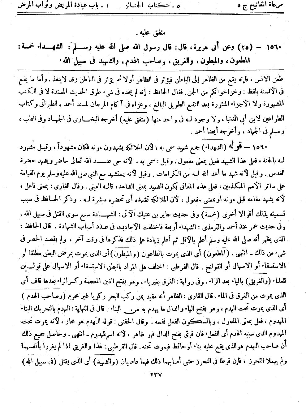 1560 - (25) وعن أبي هريرة، قال: قال رسول الله صلى الله عليه وسلم: ((الشهداء خمسة: المطعون، والمبطون، والغريق، وصاحب الهدم، والشهيد في سبيل الله))