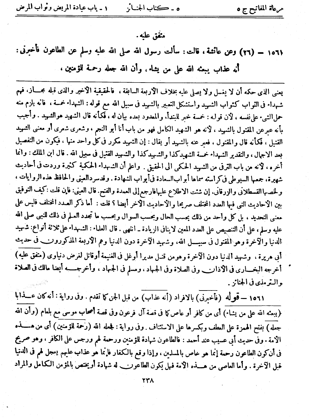 1561- قوله: (فأخبرني) بالإفراد (أنه عذاب) من قبل الجن كما تقدم. وفي رواية: أنه كان عذاباً (يبعثه الله على من يشاء) أي من كافر أو عاص كما في قصة آل فرعون وفي قصة أصحاب موسى مع بلعام (وأن الله جعله) بفتح الهمزة على العطف وبكسرها على الاستئناف. وفي رواية: فجعله الله (رحمة للمؤمنين) أي من هذه الأمة. وفي حديث أبي عسيب عند أحمد: فالطاعون شهادة للمؤمنين ورحمة لهم ورجس على الكافر، وهو صريح في أن كون الطاعون رحمة إنما هو خاص بالمسلمين، وإذا وقع بالكفار فإنما هو عذاب عليهم يعجل لهم في الدنيا قبل الآخرة. وأما العاصي من هذه الأمة فهل يكون الطاعون له شهادة أو يختص بالمؤمن الكامل والمراد