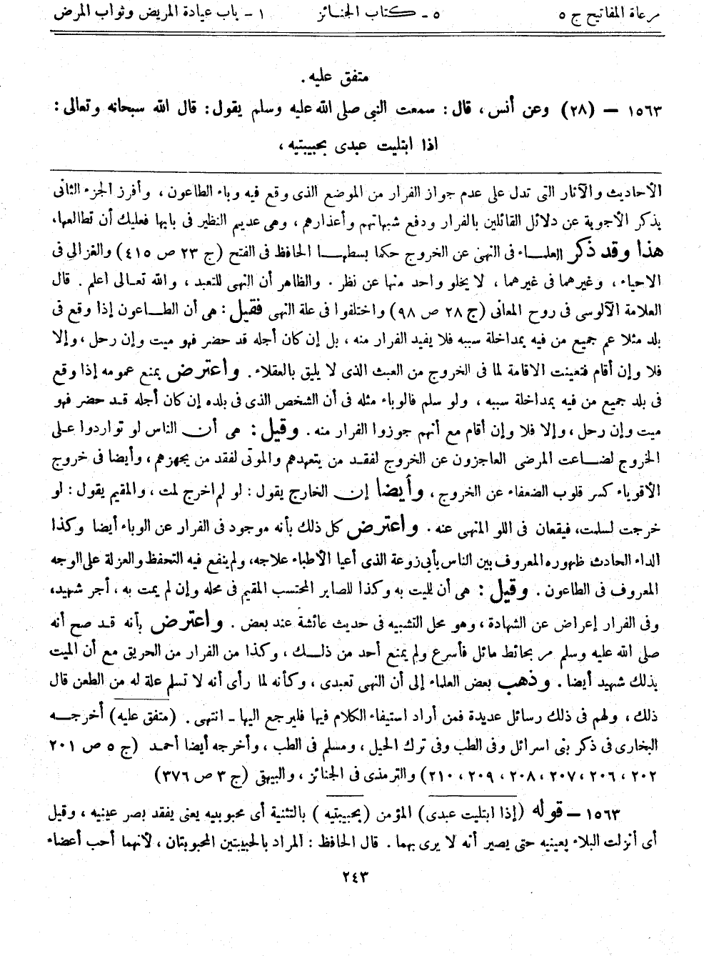 الأحاديث والآثار التي تدل على عدم جواز الفرار من الموضع الذي وقع فيه وباء الطاعون، وأفرز الجزء الثاني بذكر الأجوبة عن دلائل القائلين بالفرار ودفع شبهاتهم وأعذارهم، وهي عديم النظير في بابها فعليك أن تطالعها. هذا وقد ذكر العلماء في النهى عن الخروج حكماً بسطها الحافظ في الفتح (ج23:ص415) والغزالي في الأحياء، وغيرهما في غيرهما، لا يخلوا واحد منها عن نظر. والظاهر أن النهى للتعبد، والله تعالى اعلم. قال العلامة الآلوسي في روح المعاني (ج28:ص98) واختلفوا في علة النهى فقيل: هي أن الطاعون إذا وقع في بلد مثلاً عم جميع من فيه بمداخلة سببه فلا يفيد الفرار منه، بل إن كان أجله قد حضر فهو ميت وإن رحل، وإلا فلا وإن أقام فتعينت الإقامة لما في الخروج من العبث الذي لا يليق بالعقلاء. واعترض بمنع عمومه إذا وقع في بلد جميع من فيه بمداخلة سببه، ولو سلم فالوباء مثله في أن الشخص الذي في بلده إن كان أجله قد حضر فهو ميت وإن رحل، وإلا فلا وإن أقام مع أنهم جوزوا الفرار منه. وقيل: هي أن الناس لو تواردوا على الخروج لضاعت المرضى العاجزون عن الخروج لفقد من يتعهدهم والموتى لفقد من يجهزهم، وأيضاً في خروج الأقوياء كسر قلوب الضعفاء عن الخروج، وأيضاً إن الخارج يقول: لو لم أخرج لمت، والمقيم يقول: لو خرجت لسلمت، فيقعان في اللو المنهى عنه. واعترض كل ذلك بأنه موجود في الفرار عن الوباء أيضاً وكذا الداء الحادث ظهوره المعروف بين الناس بأبي زوعة الذي أعيا الأطباء علاجه، ولم ينفع فيه التحفظ والعزلة على الوجه المعروف في الطاعون. وقيل: هي أن للميت به وكذا للصابر المحتسب المقيم في محله وإن لم يمت به، أجر شهيد، وفي الفرار إعراض عن الشهادة، وهو محل التشبيه في حديث عائشة عند بعض. واعترض بأنه قد صح أنه صلى الله عليه وسلم مر بحائط مائل فأسرع ولم يمنع أحد من ذلك، وكذا في الفرار من الحريق مع أن الميت بذلك شهيد أيضاً. وذهب بعض العلماء إلى أن النهى تعبدى، وكأنه لما رأى أنه لا تسلم علة له من الطعن قال ذلك، ولهم في ذلك رسائل عديدة فمن أراد استيفاء الكلام فيها فليرجع إليها- انتهى. (متفق عليه) أخرجه البخاري في ذكر بني إسرائيل وفي الطب وفي ترك الحيل، ومسلم في الطب، وأخرجه أيضاً أحمد (ج5:ص201-202-206-207-208-209-210) والترمذي في الجنائز، والبيهقي (ج3:ص376) .