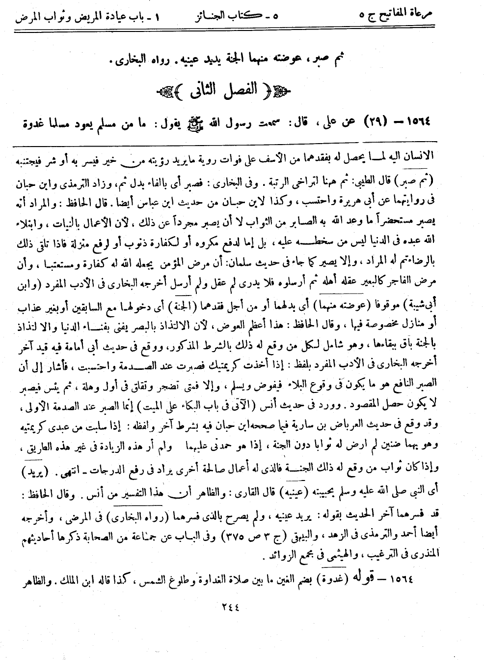 1564- (29) عن علي، قال: سمعت رسول الله صلى الله عليه وسلم يقول: ((ما من مسلم يعود مسلماً غدوة