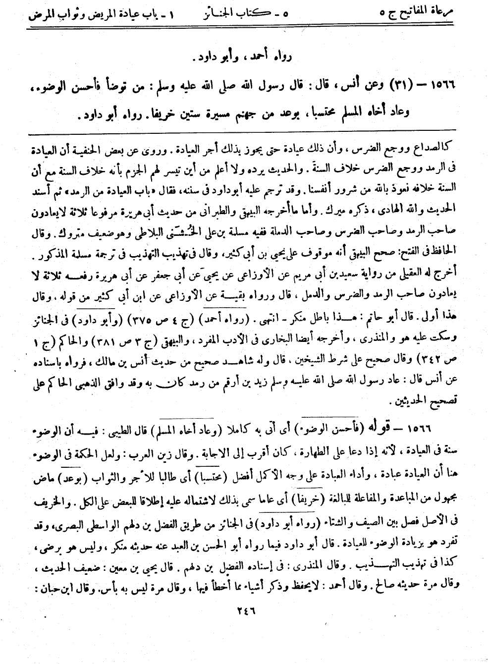 1566- (31) وعن أنس، قال: قال رسول الله صلى الله عليه وسلم: ((من توضأ فأحسن الوضوء، وعاد أخاه المسلم محتسباً، بوعد من جهنم مسيرة ستين خريفاً)) رواه أبوداود.