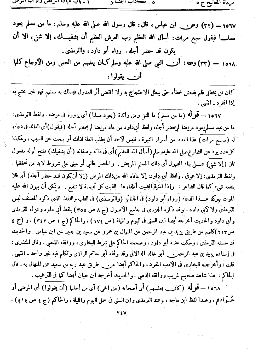 1567- (32) وعن ابن عباس، قال: قال رسول الله صلى الله عليه وسلم: ((ما من مسلم يعود مسلماً فيقول سبع مرات: أسأل الله العظيم رب العرش العظيم أن يشفيك، إلا شفى، إلا أن يكون قد حضر أجله)) رواه أبوداود، والترمذي.