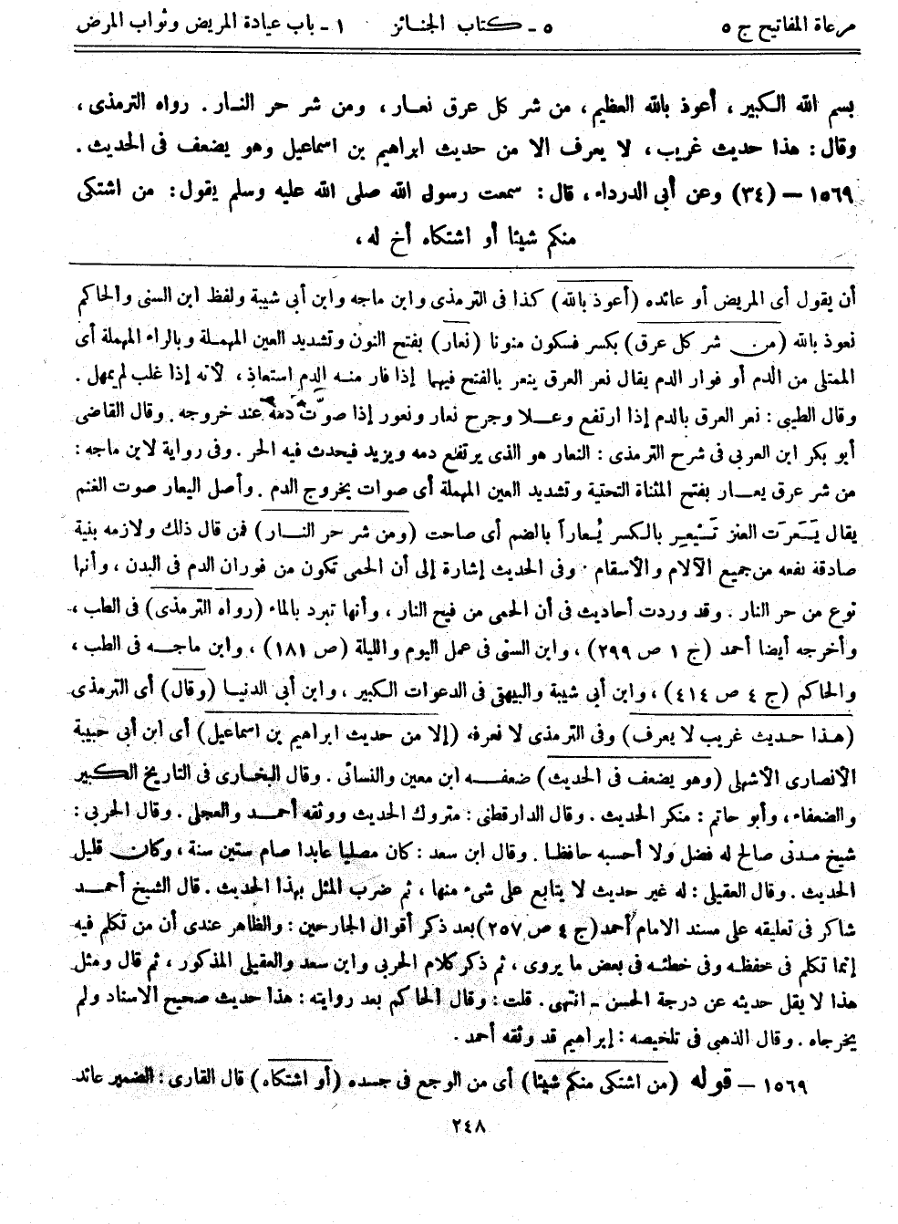 أن يقول أي المريض أو عائده (أعوذ بالله) كذا في الترمذي وابن ماجه وابن أبي شيبة ولفظ ابن السني والحاكم نعوذ بالله (من شر كل عرق) بكسر فسكون منوناً (نعار) بفتح النون وتشديد العين المهملة وبالراء المهملة أي الممتلى من الدم أو فوار الدم يقال: نعر العرق ينعر بالفتح فيهما إذا فار منه الدم استعاذ، لأنه إذا غلب لم يمهل. وقال الطيبي: نعر العرق بالدم إذا ارتفع وعلا وجرح نعار ونعور إذا صوت دمه عند خروجه. وقال القاضي أبوبكر ابن العربي في شرح الترمذي: النعار هو الذي يرتفع دمه ويزيد فيحدث فيه الحر. وفي رواية لابن ماجه: من شر عرق يعار بفتح المثناة التحتية وتشديد العين المهملة أي صوات بخروج الدم. وأصل اليعار صوت الغنم يقال: يعرت العنز تيعر بالكسر يعاراً بالضم أي صاحت (ومن شر حر النار) فمن قال ذلك ولازمه بنية صادقة نفعه من جميع الآلام والأسقام. وفي الحديث إشارة إلى أن الحمى تكون من فوران الدم في البدن، وأنها نوع من حر النار. وقد وردت أحاديث في أن الحمى من فيح النار، وأنها تبرد بالماء (رواه الترمذي) في الطب، وأخرجه أيضاً أحمد (ج1:ص299) ، وابن السني في عمل اليوم والليلة (ص181) ، وابن ماجه في الطب، والحاكم (ج4:ص414) ، وابن أبي شيبة والبيهقي في الدعوات الكبير، وابن أبي الدنيا (وقال) أي الترمذي (هذا حديث غريب لا يعرف) وفي الترمذي لا نعرفه (إلا من حديث إبراهيم بن إسماعيل) أي ابن أبي حبيبة الأنصاري الأشهلي (وهو يضعف في الحديث) ضعفه ابن معين والنسائي. وقال البخاري في التاريخ الكبير والضعفاء، وأبوحاتم: منكر الحديث. وقال الدارقطني: متروك الحديث ووثقه أحمد والعجلي. وقال الحربي: شيخ مدني صالح له فضل ولا أحسبه حافظاً. وقال ابن سعد: كان مصلياً عابداً صام ستين سنة، وكان قليل الحديث. وقال العقيلي: له غير حديث لا يتابع على شيء منها، ثم ضرب المثل بهذا الحديث. قال الشيخ أحمد شاكر في تعليقه على مسند الإمام أحمد (ج4:ص257) بعد ذكر أقوال الجارحين: والظاهر عندي أن من تكلم فيه إنما تكلم في حفظه وفي خطئه في بعض ما يروي، ثم ذكر كلام الحربي وابن سعد والعقيلي المذكور، ثم قال: ومثل هذا لا يقل حديثه عن درجة الحسن- انتهى. قلت: وقال الحاكم بعد روايته: هذا حديث صحيح الإسناد ولم يخرجاه. وقال الذهبي في تلخيصه: إبراهيم قد وثقه أحمد.