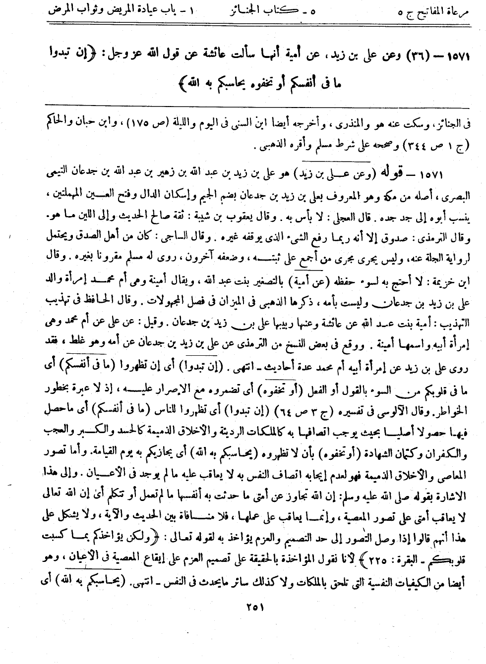 1571- (36) وعن علي بن زيد، عن أمية أنها سألت عائشة عن قول الله عزوجل: {إن تبدوا ما في أنفسكم أو تخفوه يحاسبكم به الله}