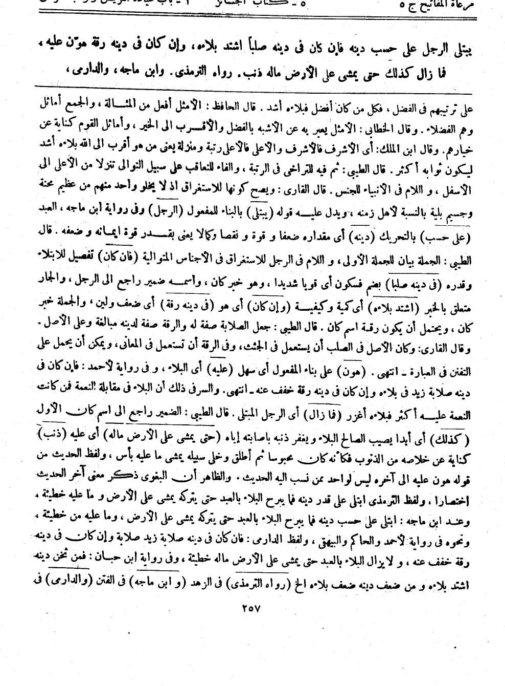 على ترتيبهم في الفضل، فكل من كان أفضل فبلاءه أشد. قال الحافظ: الأمثل أفعل من المثالة، والجمع أماثل وهم الفضلاء. وقال الخطابي: الأمثل يعبر به عن الأشبه بالفضل والأقرب إلى الخير، وأماثل القوم كناية عن خيارهم. وقال ابن الملك: أي الأشرف فالأشرف والأعلى فالأعلى رتبة ومنزلة يعني من هو أقرب إلى الله بلاءه أشد ليكون ثوابه أكثر. قال الطيبي: ثم فيه للتراخي في الرتبة، والفاء للتعاقب على سبيل التوالي تنزلاً من الأعلى إلى الأسفل، واللام في الأنبياء للجنس. قال القاري: ويصح كونها للاستغراق إذ لا يخلو واحد منهم من عظيم محنة وجسيم بلية بالنسبة لأهل زمنه، ويدل عليه قوله (يبتلى) بالبناء للمفعول (الرجل) وفي رواية ابن ماجه، العبد (على حسب) بالتحريك (دينه) أي مقداره ضعفاً وقوة ونقصاً وكمالاً يعني بقدر قوة إيمانه وضعفه. قال الطيبي: الجملة بيان للجملة الأولى، واللام في الرجل للاستغراق في الأجناس المتوالية (فإن كان) تفصيل للابتلاء وقدره (في دينه صلباً) بضم فسكون أي قوياً شديداً، وهو خبر كان، واسمه ضمير راجع إلى الرجل، والجار متعلق بالخبر (اشتد بلاءه) أي كمية وكيفية (وإن كان) أي هو (في دينه رقة) أي ضعف ولين، والجملة خبر كان، ويحتمل أن يكون رقة اسم كان. قال الطيبي: جعل الصلابة صفة له والرقة صفة لدينه مبالغة وعلى الأصل. وقال القاري: وكان الأصل في الصلب أن يستعمل في الجثث، وفي الرقة أن تستعمل في المعاني، ويمكن أن يحمل على التفنن في العبارة- انتهى. (هون) على بناء المفعول أي سهل (عليه) أي البلاء، وفي رواية لأحمد: فإن كان في دينه صلابة زيد في بلاءه وإن كان في دينه رقة خفف عنه- انتهى. والسر في ذلك أن البلاء في مقابلة النعمة فمن كانت النعمة عليه أكثر فبلاءه أغزر (فما زال) أي الرجل المبتلى. قال الطيبي: الضمير راجع إلى اسم كان الأول (كذلك) أي أبدا يصيب الصالح البلاء ويغفر ذنبه بإصابته إياه (حتى يمشي على الأرض ماله) أي عليه (ذنب) كناية عن خلاصة من الذنوب فكأنه كان محبوساً ثم أطلق وخلى سبيله يمشي ما عليه بأس، ولفظ الحديث من قوله: هون عليه إلى آخره ليس لواحد ممن نسب إليه الحديث. والظاهر أن البغوي ذكر معنى آخر الحديث اختصاراً، ولفظ الترمذي: ابتلى على قدر دينه فما يبرح البلاء بالعبد حتى يتركه يمشي على الأرض وما عليه خطيئة، وعند ابن ماجه: ابتلى على حسب دينه فما يبرح البلاء بالعبد حتى يتركه يمشي على الأرض، وما عليه من خطيئة، ونحوه في رواية لأحمد والحاكم والبيهقي، ولفظ الدارمي: فإن كان في دينه صلابة زيد صلابة وإن كان في دينه رقة خفف عنه، ولا يزال البلاء بالعبد حتى يمشي على الأرض ماله خطيئة، وفي رواية ابن حبان: فمن ثخن دينه اشتد بلاءه ومن ضعف دينه ضعف بلاءه إلخ (رواه الترمذي) في الزهد (وابن ماجه) في الفتن (والدارمي) في