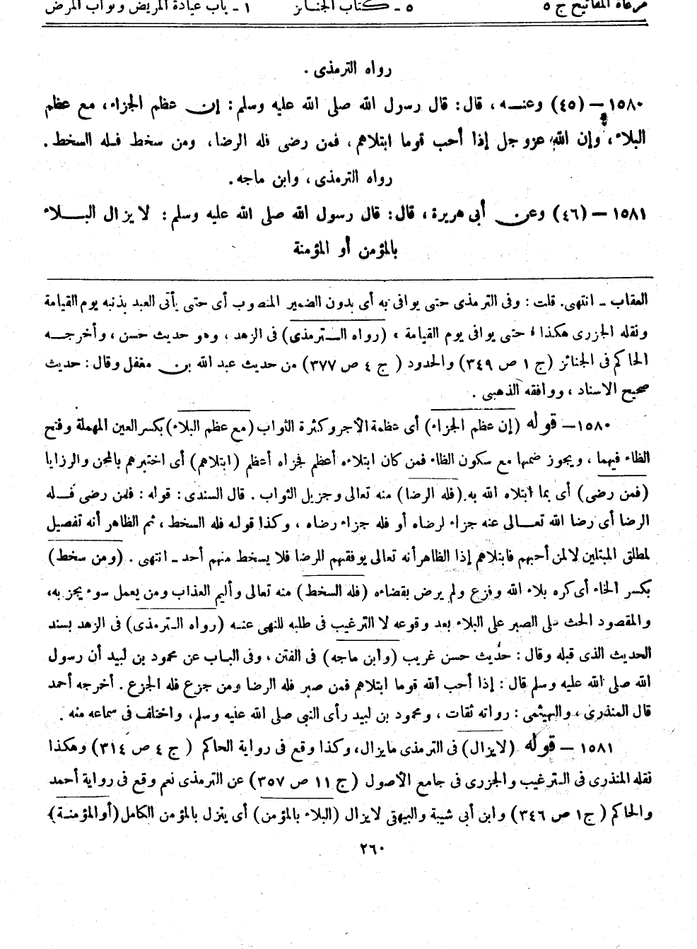 1580- (45) وعنه، قال: قال رسول الله صلى الله عليه وسلم: ((إن عظم الجزاء مع عظم البلاء، وإن الله عزوجل إذا أحب قوما ابتلاهم، فمن رضي فله الرضا، ومن سخط فله السخط)) رواه الترمذي، وابن ماجه.