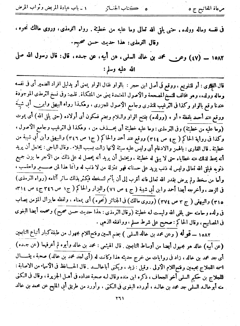 1582- قوله: (وعن محمد بن خالد السلمي) بضم السين وفتح اللام مجهول من طبقة كبار أتباع التابعين (عن أبيه) خالد وهو مجهول أيضاً من أوساط التابعين. قال الهيثمي: محمد بن خالد وأبوه لم أعرفهما (عن جده) أي جد محمد بن خالد، زاد في روايات من خرج حديثه هذا وكانت له (أي لجد محمد بن خالد) صحبة، يقال اسمه اللجلاج بجيمين وفتح اللام الأولى. زيد، ويكنى أباخالد. قال الحافظ في الأسماء من الإصابة: اللجلاج بن حكيم السلمي أخو الجحاف، ذكره ابن مندة وقال له صحبة عداده في أهل الجزيرة، وقال في الكنى منه أبوخالد السلمي جد محمد بن خالد، أورده البغوي في الكنى، وأورد من طريق أبي المليح عن محمد بن خالد