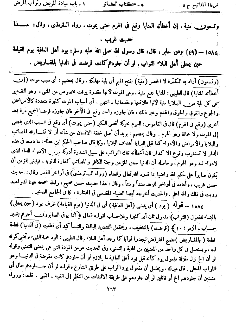 1584- (49) وعن جابر، قال: قال رسول الله صلى الله عليه وسلم: ((يود أهل العافية يوم القيامة حين يعطي أهل البلاء الثواب، لو أن جلودهم كانت قرضت في الدنيا بالمقاريض))