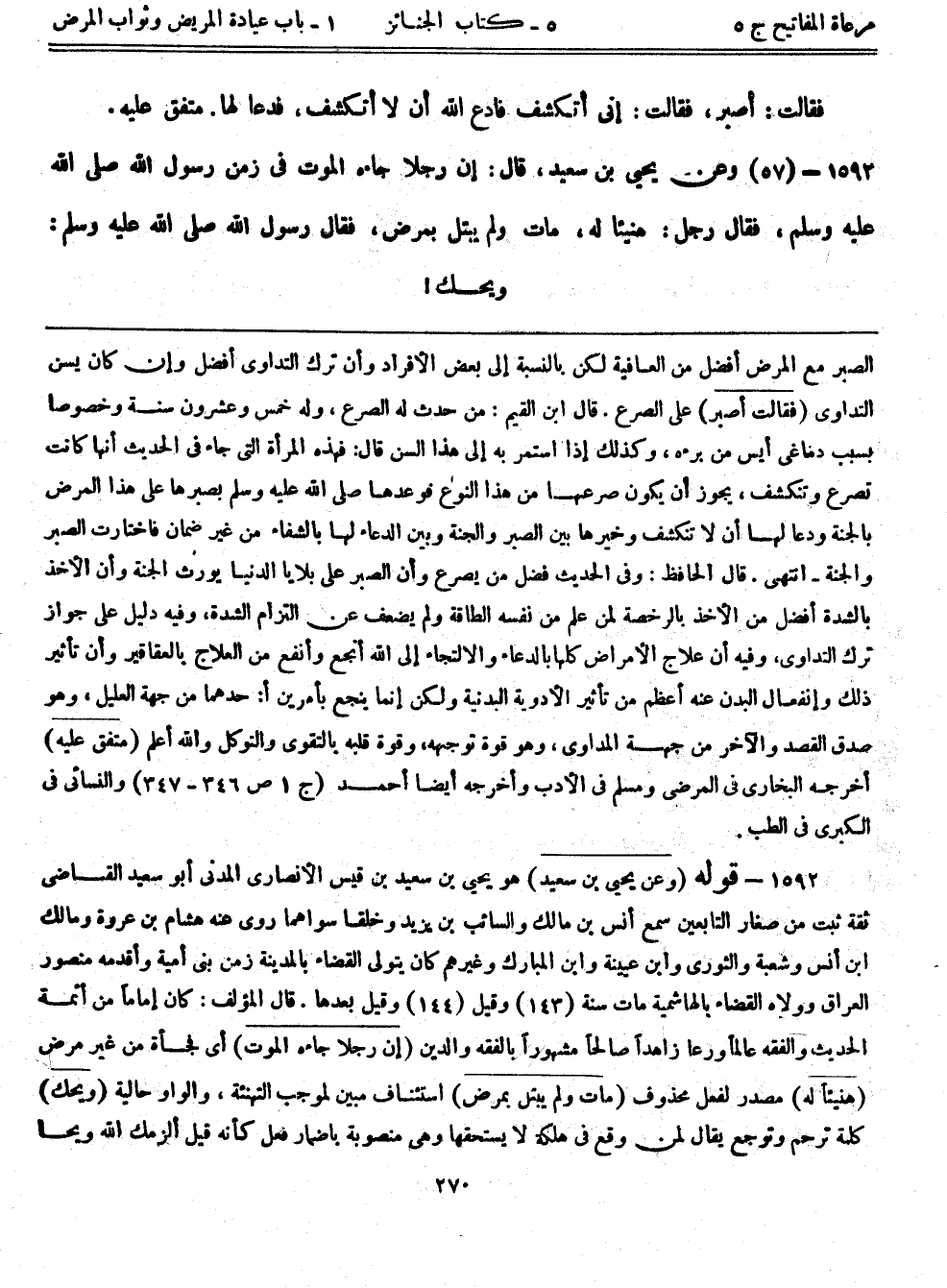 1592- قوله: (وعن يحيى بن سعيد) هو يحيى بن سعيد بن قيس الأنصاري المدني أبوسعيد القاضي ثقة ثبت من صغار التابعين سمع أنس بن مالك والسائب بن يزيد وخلقاً سواهما روى عنه هشام بن عروة ومالك ابن أنس وشعبة والثوري وابن عيينة وابن المبارك وغيرهم كان يتولى القضاء بالمدينة زمن بني أمية وأقدمه منصور العراق وولاه القضاء بالهاشمية مات سنة (143) وقيل (144) وقيل بعدها. قال المؤلف: كان إماماً من أئمة الحديث والفقه عالماً ورعاً زاهداً صالحاً مشهوراً بالفقه والدين (إن رجلاً جاءه الموت) أي فجأة من غير مرض (هنيئاً له) مصدر لفعل محذوف (مات ولم يبتل بمرض) استئناف مبين لموجب التهنئة، والواو حالية (ويحك) كلمة ترحم وتوجع يقال لمن وقع في هلكة لا يستحقها وهي منصوبة بإضمار فعل كأنه قيل ألزمك الله ويحاً