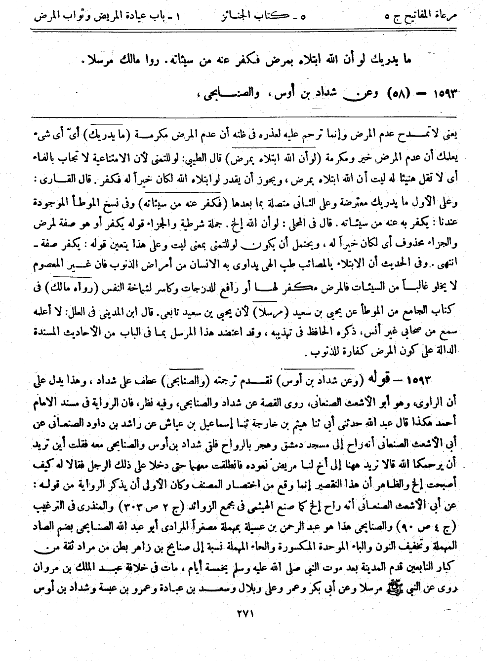 1593- قوله: (وعن شداد بن أوس) تقدم ترجمته (والصنابحى) عطف على شداد، وهذا يدل على أن الراوي، وهو أبوالأشعث الصنعاني، روى القصة عن شداد والصنابحى، وفيه نظر، فإن الرواية في مسند الإمام أحمد هكذا قال عبد الله حدثني أبي ثنا هيثم بن خارجة ثنا إسماعيل بن عياش عن راشد بن داود الصنعاني عن أبي الأشعث الصنعاني أنه راح إلى مسجد دمشق وهجر بالرواح فلقي شداد بن أوس والصنابحى معه فقلت أين تريد أن يرحمكما الله قالا نريد ههنا إلى أخ لنا مريض نعوده فانطلقت معهما حتى دخلا على ذلك الرجل فقالا له كيف أصبحت إلخ والظاهر أن هذا التقصير إنما وقع من اختصار المصنف وكان الأولى أن يذكر الرواية من قوله: عن أبي الأشعث الصنعاني أنه راح إلخ كما صنع الهيثمي في مجمع الزوائد (ج2ص303) والمنذري في الترغيب (ج4ص90) والصنابحى هذا هو عبد الرحمن بن عسيلة بمهملة مصغرا المرادي أبوعبد الله الصنابحى بضم الصاد المهملة وتخفيف النون والباء الموحدة المكسورة والحاء المهملة نسبة إلى صنابح بن زاهر بطن من مراد ثقة من كبار التابعين قدم المدينة بعد موت النبي صلى الله عليه وسلم بخمسة أيام، مات في خلافة عبد الملك بن مروان روى عن النبي - صلى الله عليه وسلم - مرسلاً وعن أبي بكر وعمر وعلي وبلال وسعد بن عبادة وعمرو بن عبسة وشداد بن أوس