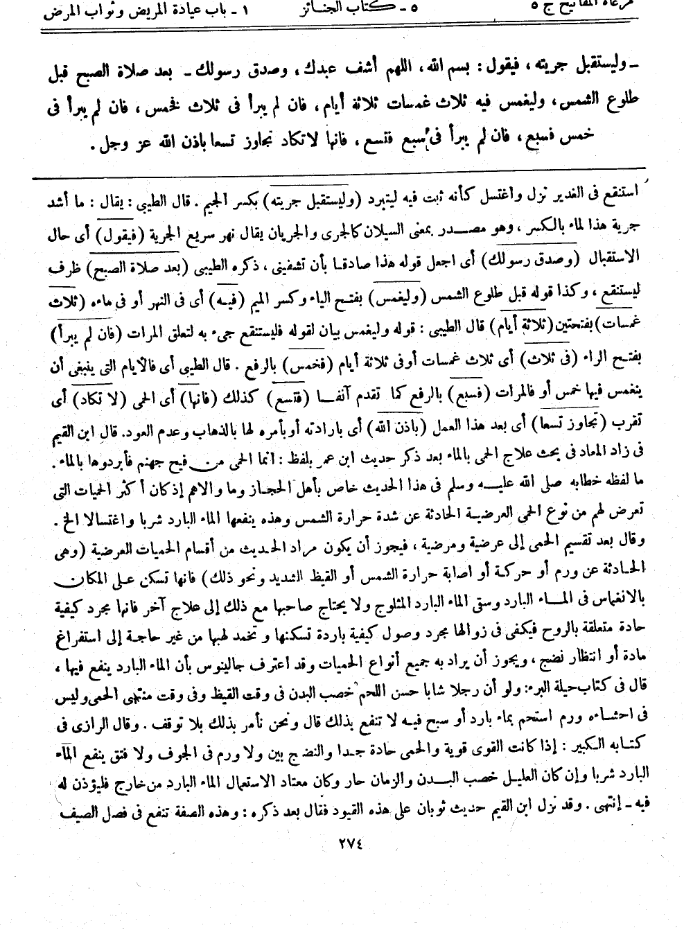 استنقع في الغدير نزل واغتسل ثبت فيه ليتبرد (وليستقبل جريته) بكسر الجيم. قال الطيبي: يقال: ما أشد جرية هذا الماء بالكسر، وهو مصدر بمعنى السيلان كالجري والجريان يقال نهر سريع الجرية (فيقول) أي حال الاستقبال (وصدق رسولك) أي اجعل قوله هذا صادقاً بأن تشفيني، ذكره الطيبي (بعد صلاة الصبح) ظرف ليستنقع، وكذا قوله قبل طلوع الشمس (وليغمس) بفتح الياء وكسر الميم (فيه) أي في النهر أو في ماءه (ثلاث غمسات) بفتحتين (ثلاثة أيام) قال الطيبي: قوله وليغمس بيان لقوله فليستنقع جيء به لتعلق المرات (فإن لم يبرأ) بفتح الراء (في ثلاث) أي ثلاث غمسات أو في ثلاثة أيام (فخمس) بالرفع. قال الطيبي: أي فالأيام التي ينبغي أن ينغمس فيها أو فالمرات (فسبع) بالرفع كما تقدم آنفاً (فتسع) كذلك (فإنها) أي الحمى (لا تكاد) أي تقرب (تجاوز تسعاً) أي بعد هذا العمل (بإذن الله) أي بإرادته أو بأمره لها بالذهاب وعدم العود. قال ابن القيم في زاد المعاد في بحث علاج الحمى بالماء بعد ذكر حديث ابن عمر بلفظ: إنما الحمى من فيح جهنم فأبردوها بالماء. ما لفظه خطابه صلى الله عليه وسلم في هذا الحديث خاص بأهل الحجاز وما والاهم إذ كان أكثر الحميات التي تعرض لهم من نوع الحمى العرضية الحادثة عن شدة حرارة الشمس وهذه ينفعها الماء البارد شرباً واغتسالاً إلخ. وقال بعد تقسيم الحمى إلى عرضية ومرضية، فيجوز أن يكون مراد الحديث من أقسام الحميات العرضية (وهي الحادثة عن ورم أو حركة أو إصابة حرارة الشمس أو القيظ الشديد ونحو ذلك) فإنها تسكن على المكان بالانغماس في الماء البارد وسقي الماء البارد المثلوج ولا يحتاج صاحبها مع ذلك إلى علاج آخر فإنها مجرد كيفية حادة متعلقة بالروح فيكفي في زوالها مجرد وصول كيفية باردة تسكنها وتخمد لهبها من غير حاجة إلى استفراغ مادة أو انتظار نضج، ويجوز أن يراد به جميع أنواع الحميات وقد اعترف جالينوس بأن الماء البارد ينفع فيها، قال في كتاب حيلة البرء: ولو أن رجلاً شاباً حسن اللحم خصب البدن في وقت القيظ وفي وقت منتهى الحمى وليس في احشاءه ورم استحم بماء بارد أو سبح فيه لا تنفع بذلك قال ونحن نأمر بذلك بلا توقف. وقال الرازي في كتابة الكبير: إذا كانت القوي قوية والحمى حادة جداً والنضج بين ولا ورم في الجوف ولا فتق ينفع الماء البارد شرباً وإن كان العليل خصب البدن والزمان حار وكان معتاد الاستعمال الماء البارد من خارج فليؤذن له فيه- انتهى. وقد نزل ابن القيم حديث ثوبان على هذه القيود فقال بعد ذكره: وهذه الصفة تنفع في فصل الصيف
