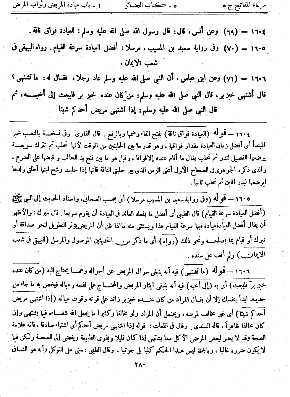 1605- (70) وفي رواية سعيد بن المسيب، مرسلاً، أفضل العيادة سرعة القيام. رواه البيهقي في شعب الإيمان.