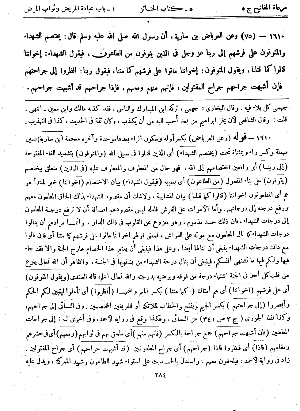 1610- قوله: (وعن العرباض) بكسر أوله وسكون الراء بعدها موحدة وآخره معجمة (ابن سارية) بسين مهملة وكسر راء وبمثناة تحت (يختصم الشهداء) أي الذين قتلوا في سبيل الله (والمتوفون) بتشديد الفاء المفتوحة (إلى ربنا) أي رافعين اختصامهم إلى الله، فهو حال من المعطوف والمعطوف عليه (في الذين) متعلق بيختصم (يتوفون) على بناء المفعول (من الطاعون) أي بسببه (فيقول للشهداء) بيان الاختصام (أخواننا) خبر لمبتدأ هو هم أي المطعونون أخواننا (قتلوا كما قتلنا) بيان المشابهة، ولا شك أن مقصود الشهداء بذلك إلحاق المطعون معهم ورفع درجته إلى درجاتهم. وأما الأموات على الفرش فلعله ليس مقصودهم أصالة أن لا ترفع درجة المطعون إلى درجات الشهداء، فإن ذلك حسد مذموم، وهو منزوع عن القلوب في ذلك الدار. وإنما مرادهم أن ينالوا درجات الشهداء كما نال المطعون مع موته على الفراش، فمعنى قولهم أخواننا ماتوا على فرشهم كما متنا أي فإن نالوا مع ذلك درجات الشهداء ينبغي أن ننالها أيضاً. وعلى هذا فينبغي أن يعتبر هذا الخصام خارج الجنة وإلا فقد جاء فيها {ولكم فيها ما تشتهي أنفسكم} ، فينبغي أن ينال درجة الشهداء من يشتهيها في الجنة، والظاهر أن الله تعالى ينزع من قلب كل أحد في الجنة اشتهاه درجة من فوقه ويرضيه بدرجته والله تعالى أعلم، قاله السندي (ويقول المتوفون) أي على فرشهم (أخواننا) أي هم أمثالنا (كما متنا) بكسر الميم وضمها (أنظروا) أي تأملوا ليتبين لكم الحكم وأبصروا (إلى جراحتهم) بكسر الجيم وبفتح والخطاب للملائكة أو للفريقين المختصمين. وفي النسائي إلى جراحهم، وكذا نقله الجزري (ج3:ص341) عن النسائي، وهكذا وقع في رواية لأحمد، وفي أخرى له: إلى جراحات المطعنين (فإن أشبهت جراحهم) جمع جراحة بالكسر (فإنهم منهم) أي ملحق بهم في ثوابهم (ومعهم) أي في حشرهم ومقامهم (فإذا) أي فنظروا فإذا (جراحهم) أي جراح المطعونين (قد أشبهت جراحهم) أي جراح المقتولين. زاد في رواية لأحمد: فيلحقون معهم. واستدل بالحديث على أستواء شهيد الطاعون وشهيد المعركة، ويدل عليه