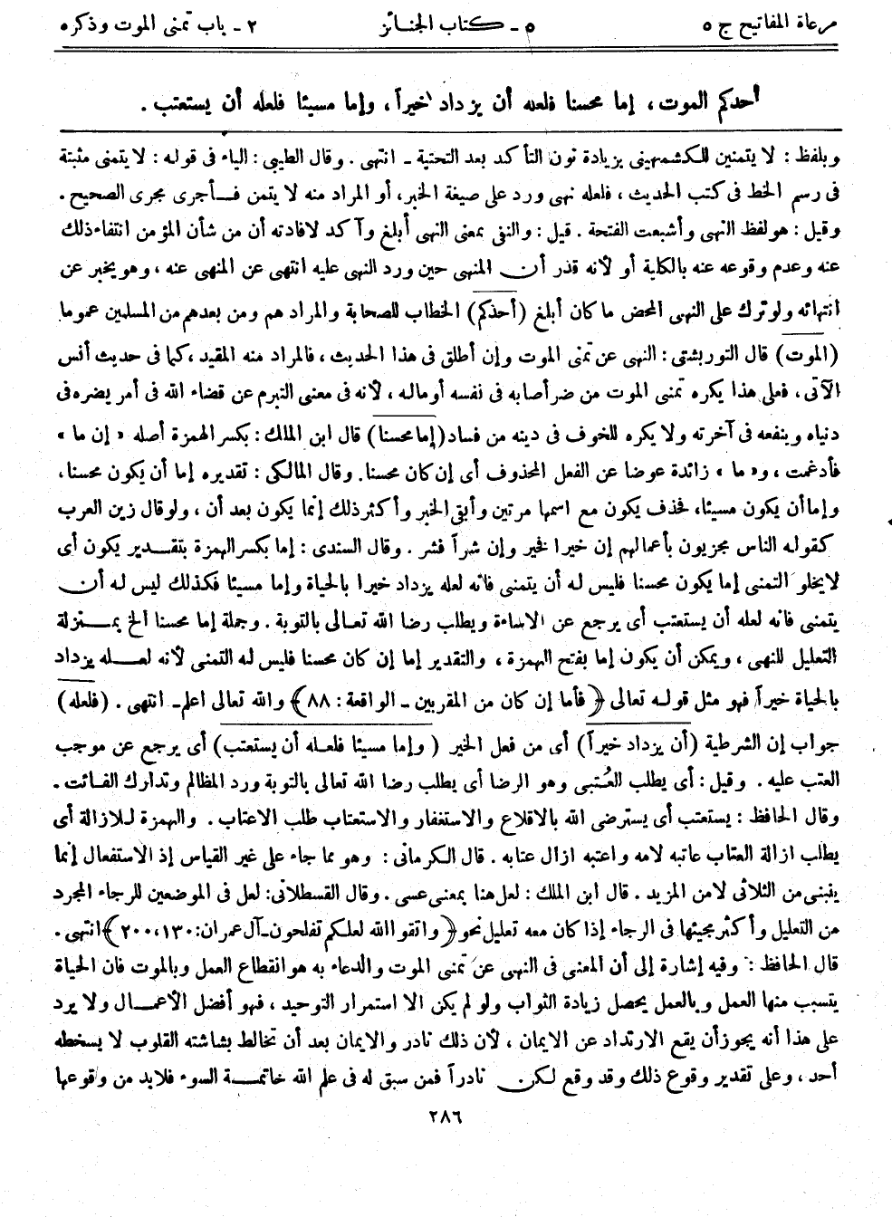 وبلفظ: لا يتمنين للكشمهيني بزيادة نون التأكيد بعد التحتية – انتهى. وقال الطيبي: الياء في قوله: لا يتمنى مثبتة في رسم الخط في كتب الحديث، فلعله نهى ورد على صيغة الخبر، أو المراد منه لا يتمن فأجرى مجرى الصحيح. وقيل: هو لفظ النهى وأشبعت الفتحة. قيل: والنفي بمعنى النهى أبلغ وآكد لإفادته أن من شأن المؤمن انتفاء ذلك عنه وعدم وقوعه عنه بالكلية أو لأنه قدر أن المنهى حين ورد النهى عليه انتهى عن المنهى عنه، وهو يخبر عن انتهائه ولو ترك على النهى المحض ما كان أبلغ (أحدكم) الخطاب للصحابة والمراد هم ومن بعدهم من المسلمين عموماً (الموت) قال التوربشتي: النهى عن تمنى الموت وإن أطلق في هذا الحديث، فالمراد منه المقيد، كما في حديث أنس الآتي، فعلى هذه يكره تمنى الموت من ضر أصابه في نفسه أو ماله، لأنه في معنى التبرم عن قضاء الله في أمر يضره في دنياه وينفعه في آخرته ولا يكره للخوف في دينه من فساد (إما محسناً) قال ابن الملك: بكسر الهمزة أصله "إن ما" فأدغمت، و"ما" زائدة عوضاً عن الفعل المحذوف أي إن كان محسناً. وقال المالكي: تقديره إما أن يكون محسناً، وإما أن يكون مسيئاً، فحذف يكون مع إسمها مرتين وأبقى الخبر وأكثر ذلك إنما يكون بعد أن، ولو قال زين العرب كقوله الناس مجزيون بأعمالهم إن خيراً فخير وإن شراً فشر. وقال السندي: إما بكسر الهمزة بتقدير يكون أي لا يخلو التمنى إما يكون محسناً فليس له أن يتمنى فإنه لعله يزداد خيراً بالحياة وإما مسيئاً فكذلك ليس له أن يتمنى فإنه لعله أن يستعتب أي يرجع عن الإساءة ويطلب رضاءالله تعالى بالتوبة. وجملة إما محسناً إلخ بمنزلة التعليل للنهى، ويمكن أن يكون إما بفتح الهمزة، والتقدير إما إن كان محسناً فليس له التمنى لأنه لعله يزداد بالحياة خيراً فهو مثل قوله تعالى: {فأما إن كان من المقربين} [الواقعة:88] والله تعالى أعلم – انتهى. (فلعله) جواب إن الشرطية (أن يزداد خيراً) أي من فعل الخير (وإما مسيئاً فلعله أي يستعتب) أي يرجع عن موجب العتب عليه. وقيل: أي يطلب العتبى وهو الرضا أي يطلب رضاءالله تعالى بالتوبة ورد المظالم وتدارك الفائت. وقال الحافظ: يستعتب أي يسترضى الله بالإقلاع والاستغفار والاستعتاب طلب الأعتاب. والهمزة للإزالة أي يطلب إزالة العتاب عاتبه لامه واعتبه أزال عتابه. قال الكرماني: وهو مما جاء على غير القياس إذ الاستفعال إنما ينبني من الثلاثي لا من المزيد. قال ابن الملك: لعل هنا بمعنى عسى. وقال القسطلاني: لعل في الموضعين للرجاء المجرد من التعليل وأكثر مجيئها في الرجاء إذا كان معه تعليل نحو {وأتقو الله لعلكم تفلحون} [آل عمران:200،130] انتهى. قال الحافظ: وفيه إشارة إلى أن المعنى في النهى عن تمنى الموت والدعاء به هو انقطاع العمل وبالموت فإن الحياة يتسبب منها العمل وبالعمل يحصل زيادة الثواب ولو لم يكن إلا استمرار التوحيد، فهو أفضل الأعمال ولا يرد على هذا أنه يجوز أن يقع الارتداد عن الإيمان، لأن ذلك نادر والإيمان بعد أن تخالط بشاشته القلوب لا يسخطه أحد، وعلى تقدير وقوع ذلك وقد وقع لكن نادراً فمن سبق له في علم الله خاتمة السوء فلا بد من وقوعها