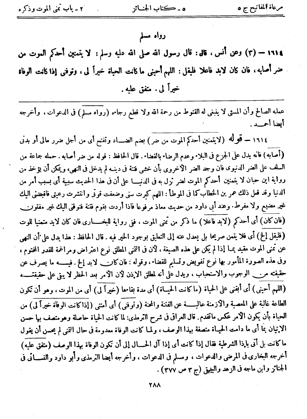 1614- (3) وعن أنس، قال: قال رسول الله صلى الله عليه وسلم: ((لا يتمنين أحدكم الموت من ضر أصابه، فإن كان لا بد فاعلاً فليقل: اللهم أحيني ما كانت الحياة خيراً لي، وتوفني إذا كانت الوفاة خيرا لي)) متفق عليه.