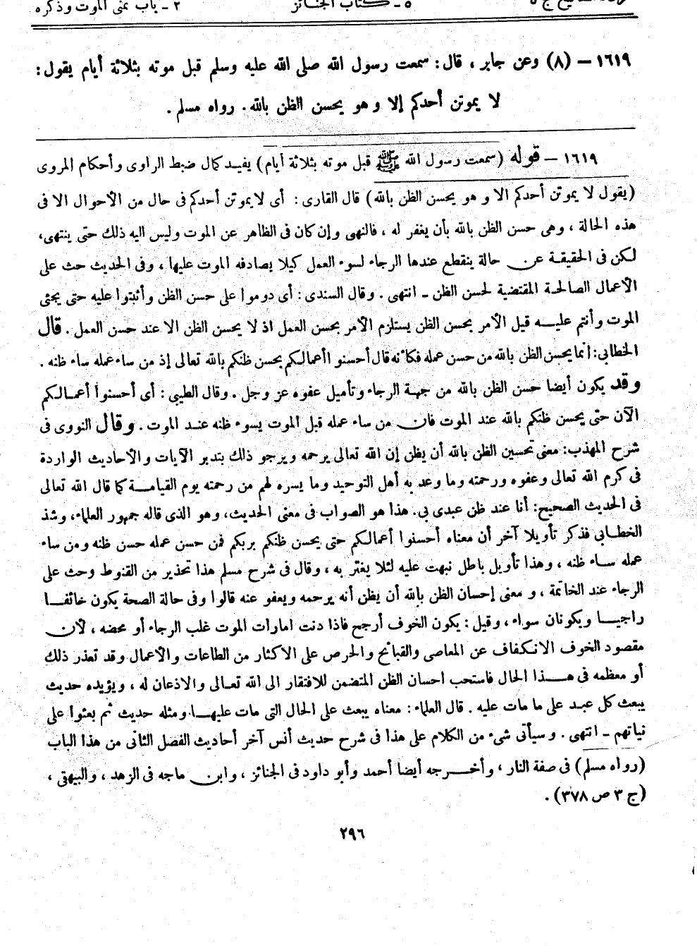 1619- (8) وعن جابر، قال: سمعت رسول الله صلى الله عليه وسلم قبل موته بثلاثة أيام يقول: ((لا يموتن أحدكم إلا وهو يحسن الظن بالله)) رواه مسلم.