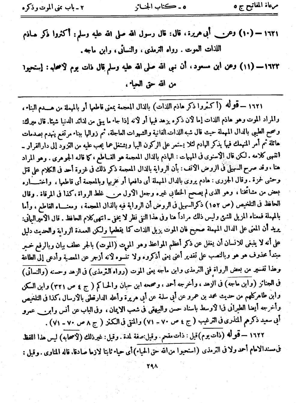 1621- (10) وعن أبي هريرة، قال: قال رسول الله صلى الله عليه وسلم: ((أكثروا ذكر هاذم اللذات الموت) رواه الترمذي، والنسائي، وابن ماجه.