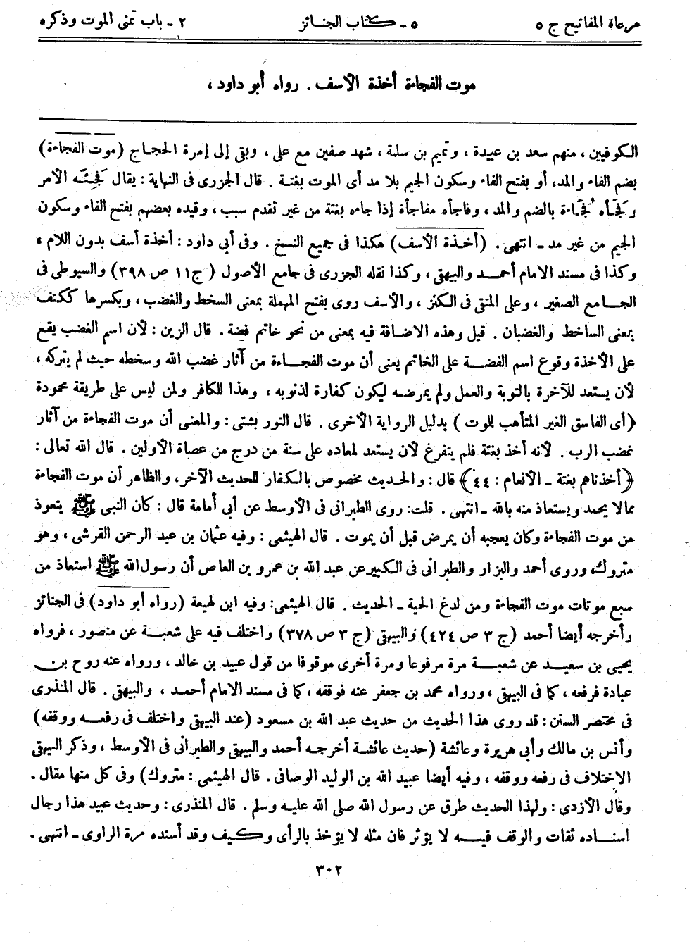 الكوفيين، منهم سعد بن عبيدة، وتميم بن سلمة، شهد صفين مع علي، وبقي إلى إمرة الحجاج (موت الفجاءة) بضم الفاء والمد، أو بفتح الفاء وسكون الجيم بلا مد أي الموت بغتة. قال الجزري في النهاية: يقال فَجِئَه الأمر وَفَجأهُ فَجاءة بالضم والمد، وفاجأه مفاجأة إذا جاءه بغتة من غير تقدم سبب، وقيده بعضهم بفتح الفاء وسكون الجيم من غير مد- انتهى. (أخذة الأسف) هكذا في جميع النسخ. وفي أبي داود: أخذة أسف بدون اللام، وكذا في مسند الإمام أحمد والبيهقي، وكذا نقله الجزري في جامع الأصول (ج11ص398) والسيوطي في الجامع الصغير، وعلى المتقى في الكنز، والأسف روى بفتح المهملة بمعنى السخط والغضب، وبكسرها ككتف بمعنى الساخط والغضبان. قيل وهذه الإضافة فيه بمعنى من نحو خاتم فضة. قال الزين: لأن اسم الغضب يقع على الأخذة وقوع اسم الفضة على الخاتم يعني أن موت الفجاءة من آثار غضب الله وسخطه حيث لم يتركه، لأن يستعد للآخرة بالتوبة والعمل ولم يمرضه ليكون كفارة لذنوبه، وهذا للكافر ولمن ليس على طريقة محمودة (أي الفاسق الغير المتأهب للموت) بدليل الرواية الأخرى. قال التوربشتي: والمعنى أن موت الفجاءة من آثار غضب الرب. لأنه أخذ بغتة فلم يتفرغ لأن يستعد لمعاده على سنة من درج من عصاة الأولين. قال الله تعالى: {أخذناهم بغتة} [الأنعام: 44] قال: والحديث مخصوص بالكفار للحديث الآخر، والظاهر أن موت الفجاءة مما لا يحمد ويستعاذ منه بالله- انتهى. قلت: روى الطبراني في الأوسط عن أبي أمامة قال: كان النبي - صلى الله عليه وسلم - يتعوذ من موت الفجاءة وكان يعجبه أن يمرض قبل أن يموت. قال الهيثمي: وفيه عثمان بن عبد الرحمن القرشي، وهو متروك، وروى أحمد والبزار والطبراني في الكبير عن عبد الله بن عمرو بن العاص أن رسول الله - صلى الله عليه وسلم - استعاذ من سبع موتات موت الفجاءة ومن لدغ الحية- الحديث. قال الهيثمي: وفيه ابن لهيعة (رواه أبوداود) في الجنائز وأخرجه أيضاً أحمد (ج3ص424) والبيهقي (ج3ص378) واختلف فيه على شعبة عن منصور، فرواه يحيى بن سعيد عن شعبة مرة مرفوعاً مرة أخرى موقوفاً من قول عبيد بن خالد، ورواه عنه روح بن عبادة فرفعه، كما في البيهقي، ورواه محمد بن جعفر عنه فوقفه، كما في مسند الإمام أحمد، والبيهقي. قال المنذري في مختصر السنن: قد روى هذا الحديث من حديث عبد الله بن مسعود (عند البيهقي واختلف في رفعه ووقفه) وأنس بن مالك وأبي هريرة وعائشة (حديث عائشة أخرجه أحمد والبيهقي والطبراني في الأوسط، وذكر البيهقي الاختلاف في رفعه ووقفه، وفيه أيضاً عبيد الله بن الوليد الوصافي. قال الهيثمي: متروك) وفي كل منها مقال. وقال الأزدي: ولهذا الحديث طرق عن رسول الله صلى الله عليه وسلم. قال المنذري: وحديث عبيد هذا رجال إسناده ثقات والوقف فيه لا يؤثر فإن مثله لا يؤخذ بالرأي وكيف وقد أسنده مرة الراوي- انتهى.