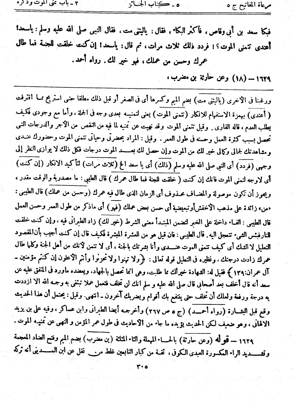 1629- قوله: (وعن حارثة) بالحاء المهملة والثاء المثلثة (بن مضرب) بضم الميم وفتح الضاد المعجمة وتشديد الراء المكسورة العبدى الكوفي، ثقة من كبار التابعين غلط من نقل عن ابن المديني أنه تركه