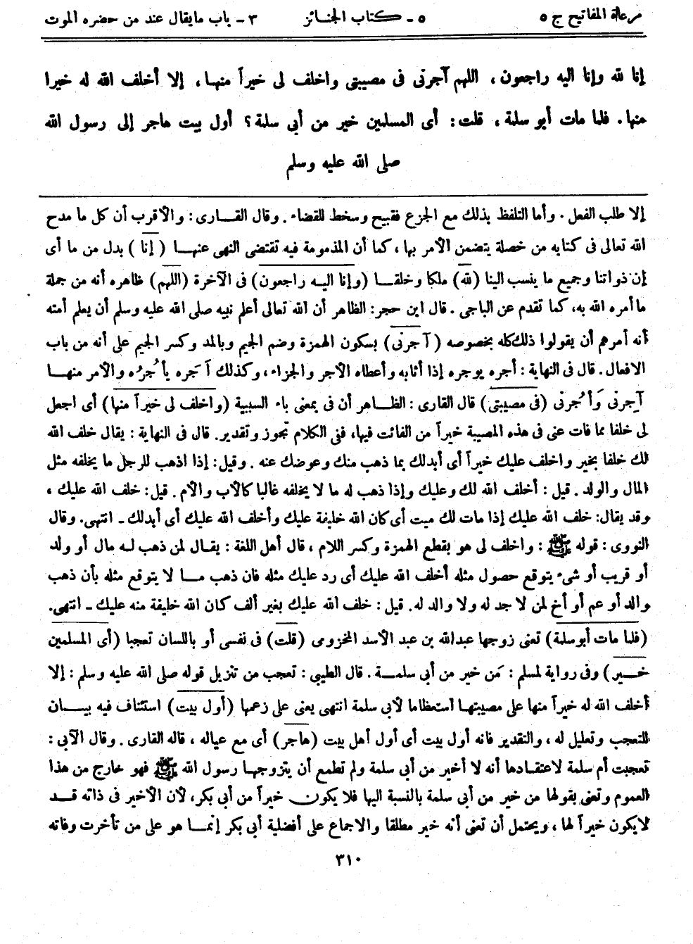 إلا طلب الفعل. وأما التلفظ بذلك مع الجزع فقبيح وسخط للقضاء. وقال القاري: والأقرب أن كل ما مدح الله تعالى في كتابه من خصلة يتضمن الأمر بها، كما أن المذمومة فيه تقتضي النهي عنها (إنا) بدل من ما أي إن ذواتنا وجميع ما ينسب إلينا (لله) ملكاً وخلقاً (وإنا إليه راجعون) في الآخرة (اللهم) ظاهره أنه من جملة ما أمره الله به، كما تقدم عن الباجي. قال ابن حجر: الظاهر أن الله تعالى أعلم نبيه صلى الله عليه وسلم أن يعلم أمته أنه أمرهم أن يقولوا ذلك كله بخصوصه (أجرني) بسكون الهمزة وضم الجيم وبالمد وكسر الجيم على أنه من باب الأفعال. قال في النهاية: أجره يوجره إذا أثابه وأعطاه الأجر والجزاء، وكذلك اَجَره يأجُرُه والأمر منها آجِرني وأجُرني (في مصيبتي) قال القاري: الظاهر أن في بمعنى باء السببية (واخلف لي خيراً منها) أي اجعل لي خلفاً مما فات عني في هذه المصيبة خيراً من الفائت فيها، ففي الكلام تجوز وتقدير. قال في النهاية: يقال خلف الله لك خلفاً بخير واخلف عليك خيراً أي أبدلك بما ذهب منك وعوضك عنه. وقيل: إذا اذهب للرجل ما يخلفه مثل المال والولد. قيل: أخلف الله لك وعليك وإذا ذهب له ما لا يخلفه غالباً كالأب والأم. قيل: خلف الله عليك، وقد يقال: خلف الله عليك إذا مات لك ميت أي كان الله خليفة عليك وأخلف الله عليك أي أبدلك- انتهى. وقال النووي: قوله - صلى الله عليه وسلم -: واخلف لي هو بقطع الهمزة وكسر اللام، قال أهل اللغة: يقال لمن ذهب له مال أو ولد أو قريب أو شيء يتوقع حصول مثله أخلف الله عليك أي رد عليك مثله فإن ذهب ما لا يتوقع مثله بأن ذهب والد أو عم أو أخ لمن لا جد له ولا والد له. قيل: خلف الله عليك بغير ألف كان الله خليفة منه عليك - انتهى. (فلما مات أبوسلمة) تعني زوجها عبد الله بن عبد الأسد المخزومي (قلت) في نفسي أو باللسان تعجباً (أي المسلمين خير) وفي رواية لمسلم: مَن خير من أبي سلمة. قال الطيبي: تعجب من تنزيل قوله صلى الله عليه وسلم: إلا أخلف الله خيراً منها على مصيبتها استعظاماً لأبي سلمة انتهى يعني على زعمها (أول بيت) استئناف فيه بيان للتعجب وتعليل له، والتقدير فإنه أول بيت أي أول أهل بيت (هاجر) أي مع عياله، قاله القاري. وقال الآبي: تعجبت أم سلمة لاعتقادها أنه لا أخير من أبي سلمة ولم تطمع أن يتزوجها رسول الله - صلى الله عليه وسلم - فهو خارج من هذا العموم وتعني بقولها من خير من أبي سلمة بالنسبة إليها فلا يكون خيراً من أبي بكر، لأن الأخير في ذاته قد لا يكون خيراً لها، ويحتمل أن تعني أنه خير مطلقاً والإجماع على أفضلية أبي بكر إنما هو على من تأخرت وفاته