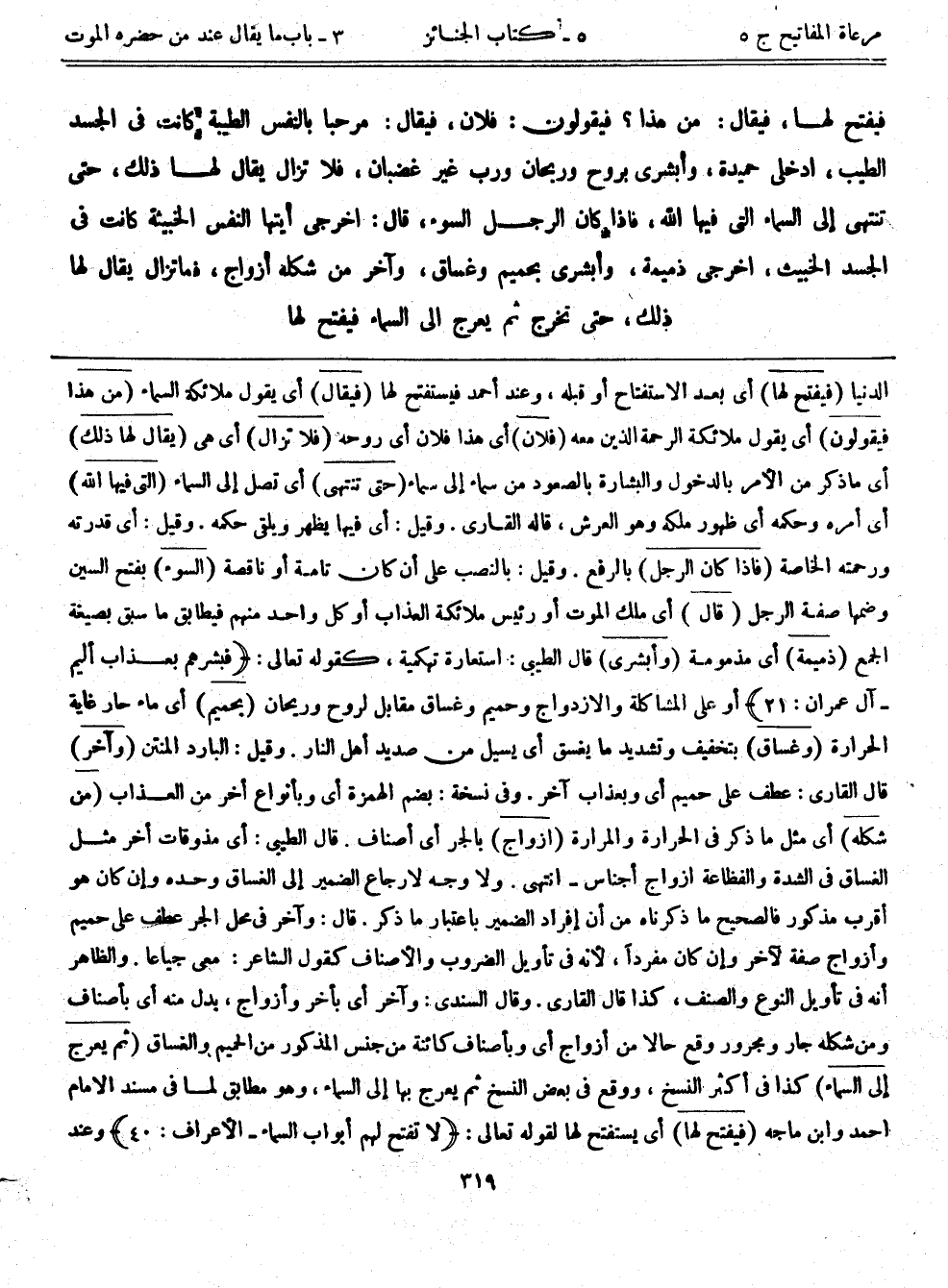 أي الدنيا (فيفتح لها) أي بعد الاستفتاح أو قبله، وعند أحمد: فيستفتح لها (فيقال) أي يقول ملائكة السماء (من هذا فيقولون) أي يقول ملائكة الرحمة الذين معه (فلان) أي هذا فلان أي روحه (فلا تزال) أي هي (يقال لها ذلك) أي ما ذكر من الأمر بالدخول والبشارة بالصعود من سماء إلى سماء (حتى تنتهي) أي تصل إلى السماء (التي فيها الله) أي أمره وحكمه أي ظهور ملكه وهو العرش، قاله القاري. وقيل: أي فيها يظهر ويلقي حكمه. وقيل: أي قدرته ورحمته الخاصة (فإذا كان الرجل) بالرفع. وقيل: بالنصب على أن كان تامة أو ناقصة (السوء) بفتح السين وضمها صفة الرجل (قال) أي ملك الموت أو رئيس ملائكة العذاب أو كل واحد منهم فيطابق ما سبق بصيغة الجمع (ذميمة) أي مذمومة (وأبشري) قال الطيبي: استعارة تهكمية، كقوله تعالى: {فبشرهم بعذاب أليم} [آل عمران: 21] أو على المشاكلة والازدواج وحميم وغساق مقابل لروح وريحان (بحميم) أي ماء حار غاية الحرارة (وغساق) بتخفيف وتشديد ما يغسق أي يسيل من صديد أهل النار. وقيل: البارد المنتن (وآخر) قال القاري: عطف على حميم أي وبعذاب آخر. وفي نسخة: بضم الهمزة أي وبأنواع آخر من العذاب (من شكله) أي مثل ما ذكر في الحرارة والمرارة (أزواج) بالجر أي أصناف. قال الطيبي: أي مذوقات آخر مثل الغساق في الشدة والفظاعة أزواج أجناس- انتهى. ولا وجه لإرجاع الضمير إلى الغساق وحده وإن كان هو أقرب مذكور فالصحيح ما ذكرناه من أن إفراد الضمير باعتبار ما ذكر. قال: وآخر في محل الجر عطف على حميم وأزواج صفة لآخر وإن كان مفرداً، لأنه في تأويل الضروب والأصناف كقول الشاعر: معي جياعاً. والظاهر أنه في تأويل النوع والصنف، كذا قال القاري. وقال السندي: وآخر أي بأخر وأزواج، بدل منه أي بأصناف ومن شكله جار ومجرور وقع حالاً من أزواج أي وبأصناف كائنة من جنس المذكور من الحميم والغساق (ثم يعرج إلى السماء) كذا في أكثر النسخ، ووقع في بعض النسخ ثم يعرج بها إلى السماء، وهو مطابق لما في مسند الإمام أحمد وابن ماجه (فيفتح لها) أي يستفتح لها لقوله تعالى: {لا تفتح لهم أبواب السماء} [الأعراف: 40] وعند