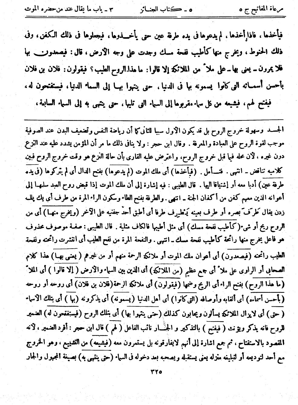 الجسد وسهولة خروج الروح بل قد يكون الأول سبباً للثاني كما أن رياضة النفس وتضعيف البدن عند الصوفية موجب لقوة الروح على العبادة والمعرفة. وقال ابن حجر: ولا ينافي ذلك ما مر أن المؤمن يشدد عليه عند النزع دون غيره، لأن محله فيما قبل خروج الروح، واعترض عليه القاري بأن حالة النزع هو وقت خروج الروح فبين كلاميه تناقض- انتهى. فتأمل. (فيأخذها) أي ملك الموت (لم يدعوها) بفتح الدال أي لم يتركوها (في يده طرفة عين) أدباً معه أو اشتياقاً إليها. قال الطيبي: فيه إشارة إلى أن ملك الموت إذا قبض روح العبد سلمها إلى أعوانه الذين معهم كفن من أكفان الجنة- انتهى. والطرفة بفتح الطاء وسكون الراء المرة من طرف أي يك بلك زدن يقال: طَرَفَ بصره أو طرف بعينه يَطْرِف طرفاً أي أطبق أحد جفنيه على الآخر (ويخرج منها) أي من الروح ريح أو شيء (كأطيب نفحة مسك) أي مثل أطيبها فالكاف مثليه. قال الطيبي: صفة موصوف محذوف هو فاعل يخرج منها رائحة كأطيب نفحة مسك- انتهى. والنفحة المرة من نفح الطيب أي انتشرت رائحته ونفحة الطيب رائحته (فيصعدون) أي أعوان ملك الموت أو ملائكة الرحمة منهم أو من غيرهم (يعني بها) هذا كلام الصحابي أو الراوي على ملأ أي جمع عظيم (من الملائكة) أي الذين بين السماء والأرض (إلا قالوا) أي الملأ (ما هذا الروح) بفتح الراء أي الريح وضمها (فيقولون) أي ملائكة الرحمة (فلان بن فلان) أي روحه أو روحه (بأحسن أسماءه) أي ألقابه وأوصافه (التي كانوا) أي أهل الدنيا (يسمونه) أي يذكرونه (بها) أي بتلك الأسماء (حتى) أي لا يزال الملائكة يسألون ويجابون كذلك (حتى ينتهوا بها) أي بتلك الروح (فيستفتحون له) الضمير للروح فإنه يذكر ويؤنث (فيفتح) بالتذكير والجار نائب الفاعل (لهم) قال ابن حجر: أفرد الضمير، لأنه المقصود بالاستفتاح، ثم جمع إشارة إلى أنهم لا يفارقونه بل يستمرون معه (فيشيعه) من التشييع، وهو الخروج مع أحد لتوديعه أو لتبليغه منزله يعني يستقبله ويصحبه بعد دخوله في السماء (حتى ينتهي به) بصيغة المجهول والجار