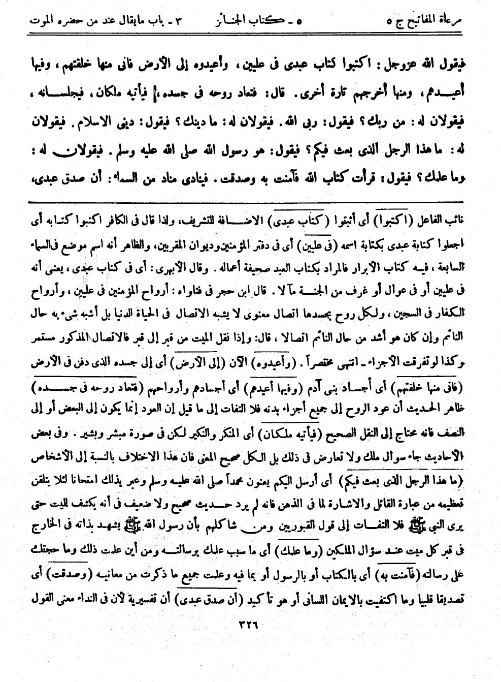 نائب الفاعل (اكتبوا) أي أثبتوا (كتاب عبدي) الإضافة للتشريف، ولذا قال في الكافر اكتبوا كتابه أي اجعلوا كتابة عبدي بكتابة اسمه (في عليين) أي في دفتر المؤمنين وديوان المقربين، والظاهر أنه اسم موضع في السماء السابعة، فيه كتاب الأبرار فالمراد بكتاب العبد صحيفة أعماله. وقال الأبهري: أي في كتاب عبدي، يعني أنه في عليين أو في عوال أو غرف من الجنة مآلاً. قال ابن حجر في فتاواه: أرواح المؤمنين في عليين، وأرواح الكفار في السجين، ولكل روح بجسدها اتصال معنوي لا يشبه الاتصال في الحياة الدنيا بل أشبه شيء به حال النائم وإن كان هو أشد من حال النائم اتصالاً، قال: وإذا نقل الميت من قبر إلى قبر فالاتصال المذكور مستمر وكذا لو تفرقت الأجزاء- انتهى مختصراً. (وأعيدوه) الآن (إلى الأرض) أي إلى جسده الذي دفن في الأرض (فإني منها خلقتهم) أي أجساد بني آدم (وفيها أعيدهم) أي أجسادهم وأرواحهم (فتعاد روحه في جسده) ظاهر الحديث أن عود الروح إلى جميع أجزاء بدنه فلا التفات إلى ما قيل إن العود إنما يكون إلى البعض أو إلى النصف فإنه محتاج إلى النقل الصحيح (فيأتيه ملكان) أي المنكر والنكير لكن في صورة مبشر وبشير. وفي بعض الأحاديث جاء سؤال ملك ولا تعارض في ذلك بل الكل صحيح المعنى فإن هذا الاختلاف بالنسبة إلى الأشخاص (ما هذا الرجل الذي بعث فيكم) أي أرسل إليكم يعنون محمداً صلى الله عليه وسلم وعبر بذلك امتحاناً لئلا يتلقن تعظيمه من عبارة القائل والإشارة لما في الذهن فإنه لم يرد حديث صحيح ولا ضعيف في أنه يكشف للميت حتى يرى النبي - صلى الله عليه وسلم - فلا التفات إلى قول القبوريين ومن شاكلهم بأن رسول الله - صلى الله عليه وسلم - يشهد بذاته في الخارج في قبر كل ميت عند سؤال الملكين (وما علمك) أي ما سبب علمك برسالته ومن أين علمت ذلك وما حجتك على رسالته (فآمنت به) أي بالكتاب أو بالرسول أو بما فيه وعلمت جميع ما ذكرت من معانيه (وصدقت) أي تصديقا قلبياً وما اكتفيت بالإيمان اللساني أو هو تأكيد (أن صدق عبدي) أن تفسيرية؛ لأن في النداء معنى القول