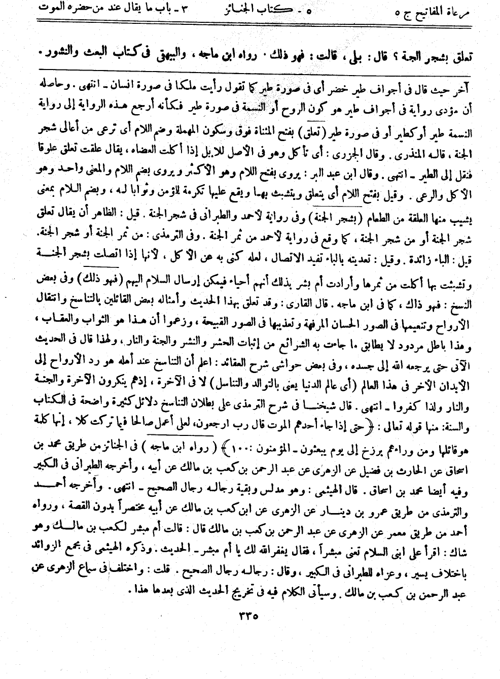 آخر حيث قال في أجواف طير خضر أي في صورة طير كما تقول رأيت ملكاً في صورة إنسان- انتهى. وحاصله أن مؤدي رواية في أجواف طير هو كون الروح أو النسمة في صورة طير فكأنه أرجع هذه الرواية إلى رواية النسمة طير أو كطير أو في صورة طير (تعلق) بفتح المثناة فوق وسكون المهملة وضم اللام أي ترعى من أعلي شجر الجنة، قاله المنذري. وقال الجزري: أي تأكل وهو في الأصل للإبل إذا أكلت العضاه، يقال: علقت تعلق علوقاً فنقل إلى الطير- انتهى. وقال ابن عبد البر: يروي بفتح اللام وهو الأكثر ويروي بضم اللام والمعنى واحد وهو الأكل والرعي. وقيل بفتح اللام أي يتعلق ويتشبث بها ويقع عليها تكرمة للمؤمن وثواباً له، وبضم اللام بمعنى يشيب منها العلقة من الطعام (بشجر الجنة) وفي رواية لأحمد والطبراني في شجر الجنة. قيل: الظاهر أن يقال تعلق شجر الجنة أو من شجر الجنة، كما وقع في رواية لأحمد من ثمر الجنة. وفي الترمذي: من ثمر الجنة أو شجر الجنة. قيل: الباء زائدة. وقيل: تعديته بالباء تفيد الاتصال، لعله كنى به عن الأكل، لأنها إذا اتصلت بشجر الجنة وتشبثت بها أكلت من ثمرها وأرادت أم بشر بذلك أنهم أحياء فيمكن إرسال السلام إليهم (فهو ذلك) وفي بعض النسخ: فهو ذاك، كما في ابن ماجه. قال القاري: وقد تعلق بهذا الحديث وأمثاله بعض القائلين بالتناسخ وانتقال الأرواح وتنعيمها في الصور الحسان المرفهة وتعذيبها في الصور القبيحة، وزعموا أن هذا هو الثواب والعقاب، وهذا باطل مردود لا يطابق ما جاءت به الشرائع من إثبات الحشر والنشر والجنة والنار، ولهذا قال في الحديث الآتي حتى يرجعه الله إلى جسده، وفي بعض حواشي شرح العقائد: اعلم أن التناسخ عند أهله هو رد الأرواح إلى الأبدان الأخر في هذا العالم (أي عالم الدنيا يعني بالتوالد والتناسل) لا في الآخرة، إذ هم ينكرون الآخرة والجنة والنار ولذا كفروا- انتهى. قال شيخنا في شرح الترمذي على بطلان التناسخ دلائل كثيرة واضحة في الكتاب والسنة: منها قوله تعالى: {حتى إذا جاء أحدهم الموت قال رب ارجعون، لعلي أعمل صالحاً فيما تركت كلا، إنها كلمةٌ هو قائلها ومن ورائهم برزخ إلى يوم يبعثون} [المؤمنون: 100] (رواه ابن ماجه) في الجنائز من طريق محمد بن إسحاق عن الحارث بن فضيل عن الزهري عن عبد الرحمن بن كعب بن مالك عن أبيه، وأخرجه الطبراني في الكبير وفيه أيضاً محمد بن إسحاق. قال الهيثمي: وهو مدلس وبقية رجاله الصحيح - انتهى. وأخرجه أحمد والترمذي من طريق عمرو بن دينار عن الزهري عن ابن كعب بن مالك عن أبيه مختصراً بدون القصة، ورواه أحمد من طريق معمر عن الزهري عن عبد الرحمن بن كعب بن مالك قال: قالت أم مبشر لكعب بن مالك وهو شاك: اقرأ على ابني السلام تعني مبشراً، فقال: يغفر الله لك يا أم مبشر- الحديث. وذكره الهيثمي في مجمع الزوائد باختلاف يسير، وعزاه للطبراني في الكبير، وقال: رجاله رجال الصحيح. قلت: واختلف في سماع الزهري عن عبد الرحمن بن كعب بن مالك. وسيأتي الكلام فيه في تخريج الحديث الذي بعدها هذا.