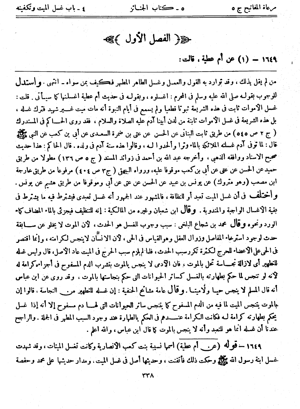 1649- قوله: (عن أم عطية) اسمها نسيبة بنت كعب الأنصارية وكانت تغسل الميتات، وقد شهدت غسل ابنة رسول الله - صلى الله عليه وسلم - وحكت ذلك فأتقنت، وحديثها أصل في غسل الميت، ومدار حديثها على محمد وحفصة