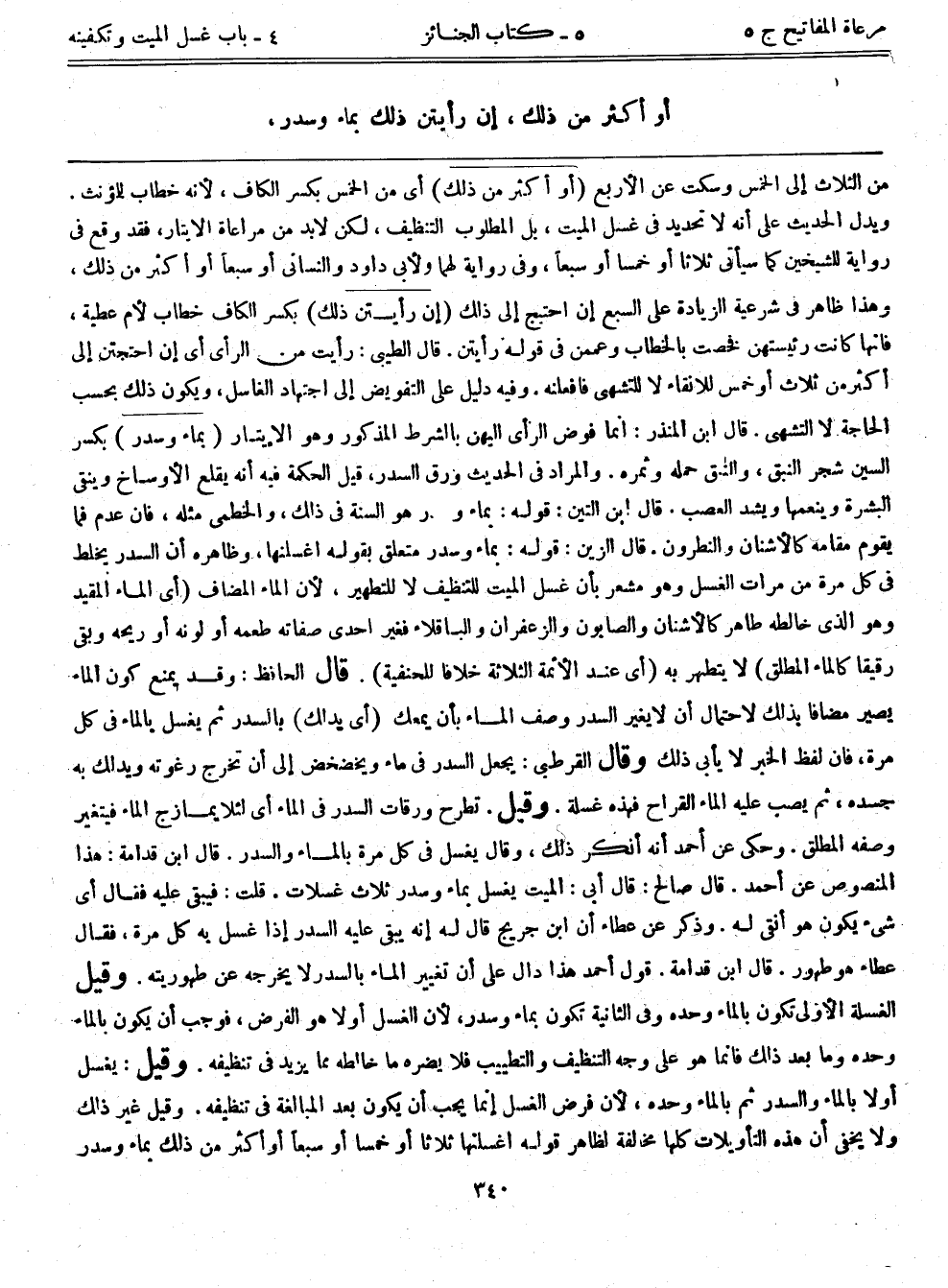 من الثلاث إلى الخمس وسكت عن الأربع (أو أكثر من ذلك) أي من الخمس بكسر الكاف، لأنه خطاب للمؤنث. ويدل الحديث على أنه لا تحديد في غسل الميت، بل المطلوب التنظيف، لكن لابد من مراعاة الايتار، فقد وقع في رواية للشيخين كما سيأتي: ثلاثاً أو خمساً أو سبعاً، وفي رواية لهما ولأبي داود والنسائي: أو سبعاً أو أكثر من ذلك، وهذا ظاهر في شرعية الزيادة على السبع إن احتيج إلى ذلك (إن رأيتن ذلك) بكسر الكاف خطاب لأم عطية، فإنها كانت رئيستهن فخصت بالخطاب وعممن في قوله رأيتن. قال الطيبي: رأيت من الرأي أي إن احتجتن إلى أكثر من ثلاث أو خمس للانقاء لا للتشهي فافعلنه. وفيه دليل على التفويض إلى اجتهاد الغاسل، ويكون ذلك بحسب الحاجة لا التشهي. قال ابن المنذر: إنما فوض الرأي إليهن بالشرط المذكور وهو الايتار (بماء وسدر) بكسر السين شجر النبق، والنبق حمله وثمره. والمراد في الحديث ورق السدر، قيل الحكمة فيه: أنه يقلع الأوساخ وينقى البشرة وينعمها ويشد العصب. قال ابن التين: قوله: بماء والسدر هو السنة في ذلك، والخطمي مثله، فإن عدم فما يقوم مقامه كالأشنان والنطرون. قال الزين: قوله: بماء وسدر متعلق بقوله اغسلنها، وظاهره أن السدر يخلط في كل مرة من مرات الغسل وهو مشعر بأن غسل الميت للتنظيف لا للتطهير، لأن الماء المضاف (أي الماء المقيد وهو الذي خالطه طاهر كالأشنان والصابون والزعفران والباقلاء فغير إحدى صفاته طعمه أو لونه أو ريحه وبقي رقيقاً كالماء المطلق) لا يتطهر به (أي عند الأئمة الثلاثة خلافاً للحنفية) . قال الحافظ: وقد يمنع كون الماء يصير مضافاً بذلك لاحتمال أن لا يغير السدر وصف الماء بأن يمعك (أي يدلك) بالسدر ثم يغسل بالماء في كل مرة، فإن لفظ الخبر لا يأبى ذلك وقال القرطبي: يجعل السدر في ماء ويخضخض إلى أن تخرج رغوته ويدلك به جسده، ثم يصب عليه الماء القراح فهذه غسله. وقيل. تطرح ورقات السدر في الماء أي لئلا يمازج الماء فيتغير وصفه المطلق. وحكى عن أحمد أنه أنكر ذلك، وقال يغسل في كل مرة بالماء والسدر. قال ابن قدامة: هذا المنصوص عن أحمد. قال صالح: قال أبي: الميت يغسل بماء وسدر ثلاث غسلات. قلت: فيبقى عليه فقال: أي شيء يكون هو أنقى له. وذكر عن عطاء أن ابن جريج قال له إنه يبقى عليه السدر إذا غسل به كل مرة، فقال عطاء هو طهور. قال ابن قدامة. قول أحمد هذا دال على أن تغيير الماء بالسدر لا يخرجه عن طهوريته. وقيل الغسلة الأولى تكون بالماء وحده وفي الثانية تكون بماء وسدر، لأن الغسل أولاً هو الفرض، فوجب أن يكون بالماء وحده وما بعد ذلك فإنما هو على وجه التنظيف والتطييب فلا يضره ما خالطه مما يزيد في تنظيفه. وقيل: يغسل أولاً بالماء والسدر ثم بالماء وحده، لأن فرض الغسل إنما يجب أن يكون بعد المبالغة في تنظيفه. وقيل غير ذلك ولا يخفى أن هذه التأويلات كلها مخالفة لظاهر قوله اغسلنها ثلاثاً أو خمساً أو سبعاً أو أكثر من ذلك بماء وسدر