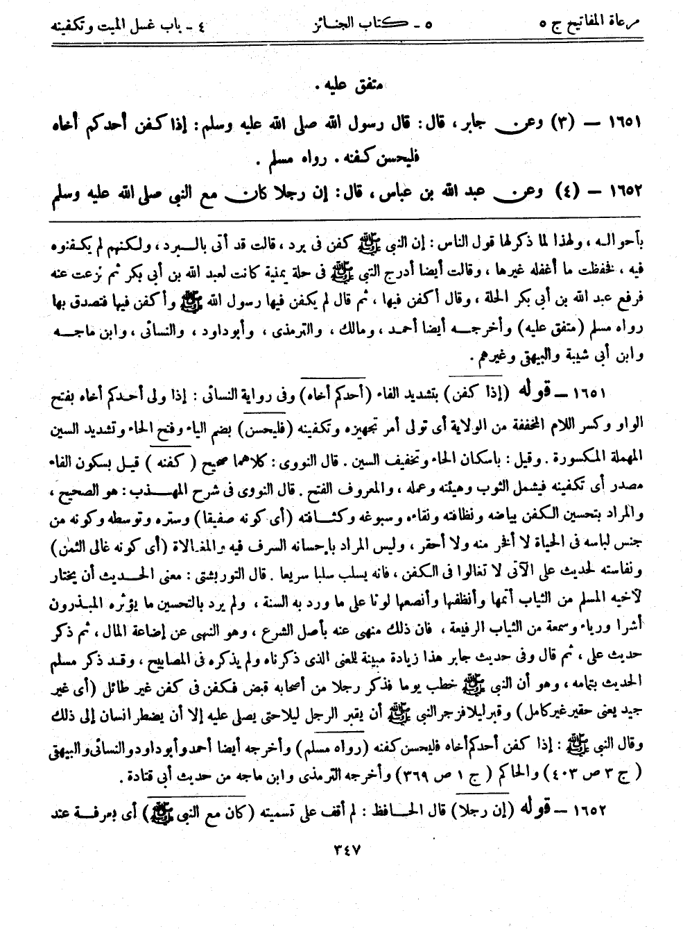 1651- (3) وعن جابر، قال: قال رسول الله - صلى الله عليه وسلم -: ((إذا أكفن أحدكم أخاه فليحسن كفنه)) رواه مسلم.
