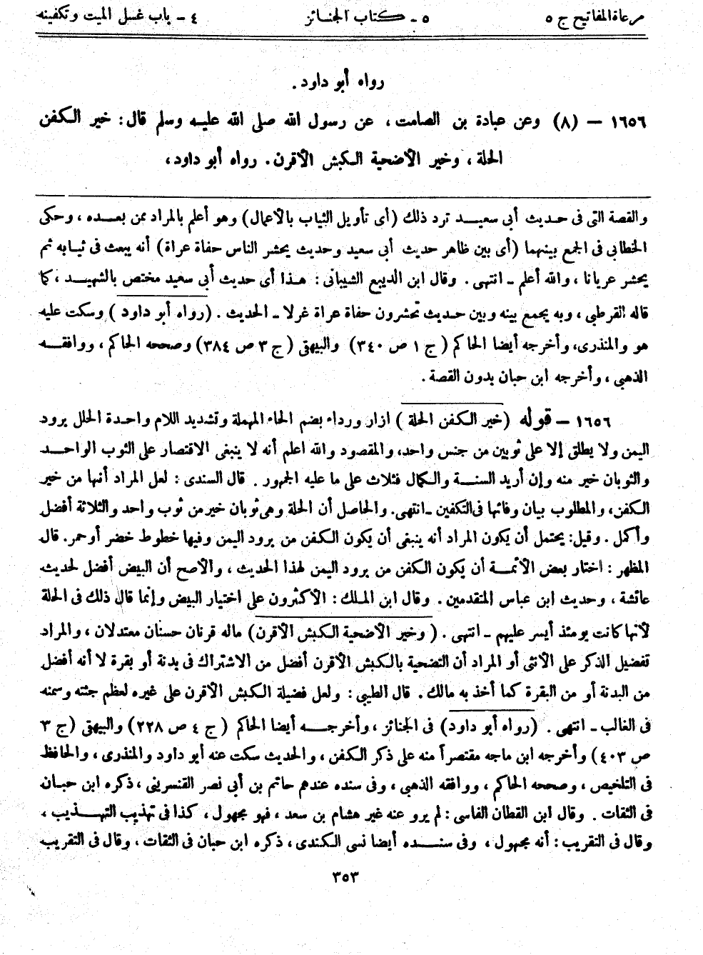 1656- (8) وعن عبادة بن الصامت، عن رسول الله - صلى الله عليه وسلم - قال: ((خير الكفن الحلة، وخير الأضحية الكبش الأقرن)) . رواه أبوداود،
