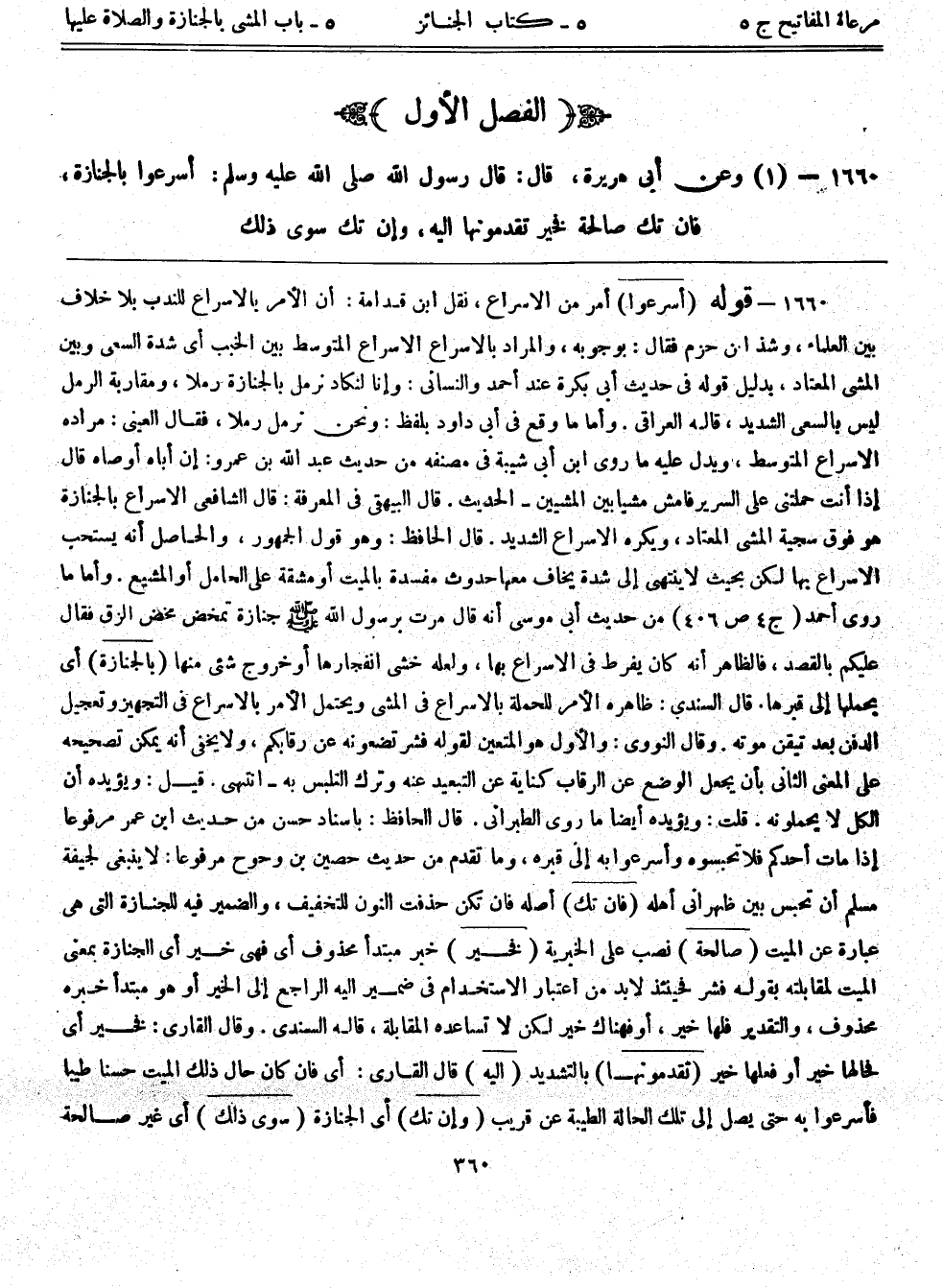 1660- (1) وعن أبي هريرة، قال: قال رسول الله عليه وسلم: ((أسرعوا بالجنازة، فإن تك صالحة فخير تقدمونها إليه، وإن تك سوى ذلك