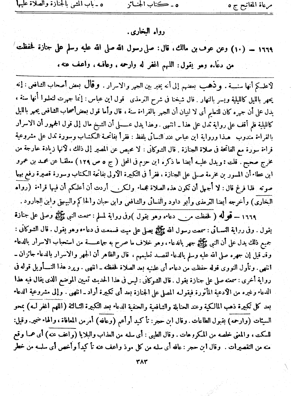 1669- قوله: (فحفظت من دعائه وهو يقول) وفي رواية لمسلم: سمعت النبي - صلى الله عليه وسلم - وصلى على جنازة يقول. وفي رواية النسائي: سمعت رسول الله - صلى الله عليه وسلم - يصلي على ميت فسمعت في دعائه وهو يقول. قال الشوكاني: جميع ذلك يدل على أن النبي - صلى الله عليه وسلم - جهر بالدعاء، وهو خلاف ما صرح به جماعة من استحباب الإسرار بالدعاء وقد قيل إن جهره - صلى الله عليه وسلم - بالدعاء لقصد تعليمهم، قال: والظاهر أن الجهر والإسرار بالدعاء جائزان-انتهى. وتأول النووي قوله حفظت من دعائه أي علمنيه بعد الصلاة فحفظته-انتهى. ويرد هذا التأويل قوله في رواية أخرى: سمعته صلى على جنازة يقول. قال الشوكاني: ليس في هذا الحديث تعيين الموضع الذي يقال فيه هذا الدعاء وغيره من الأدعية المأثورة فيقوله المصلي على الجنازة بعد أي تكبيرة أراد-انتهى. وإلى مشروعية الدعاء بعد كل تكبيرة ذهب المالكية وعند الحنابلة والشافعية والحنفية الدعاء بعد التكبيرة الثالثة. (اللهم اغفر له) بمحو السيئات. (وارحمه) بقبول الطاعات. وقال ابن حجر: تأكيد أو أعم. (وعافه) أمر من المعافاة، والهاء ضمير. وقيل: للسكت، والمعنى خلصه من المكروهات. وقال الطيبي: أي سلمه من العذاب والبلايا. (واعف عنه) أي عما وقع منه من التقصيرات. وقال ابن حجر: عافه أي سلمه من كل موذ واعف عنه تأكيداً وأخص أي سلمه من خطر
