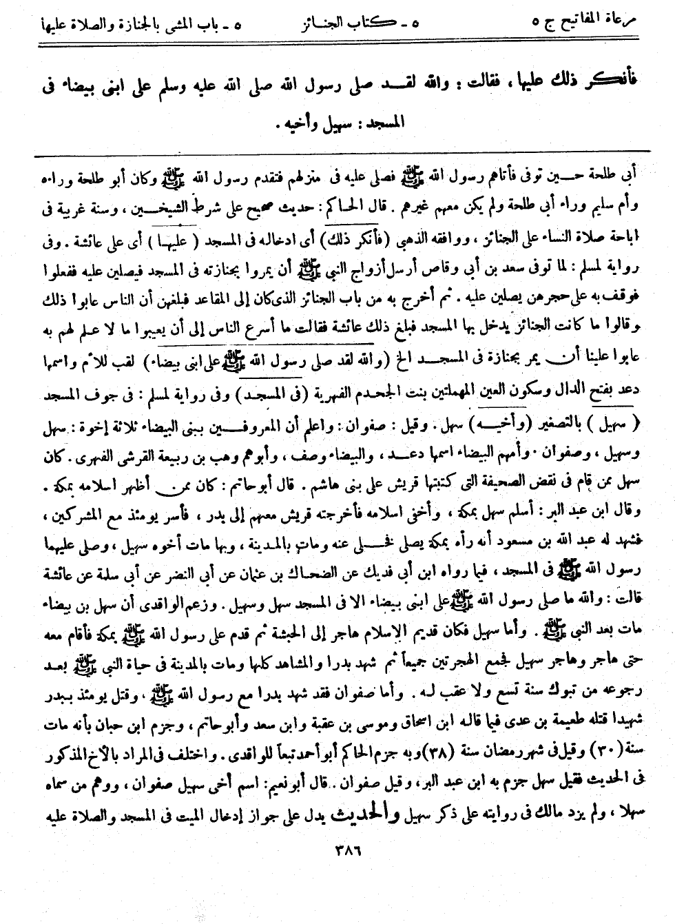 ابن أبي طلحة حين توفي فأتاهم رسول الله - صلى الله عليه وسلم - فصلى عليه في منزلهم فتقدم رسول الله - صلى الله عليه وسلم - وكان أبوطلحة وراءه وأم سليم وراء أبي طلحة ولم يكن معهم غيرهم. قال الحاكم: حديث صحيح على شرط الشيخين، وسنة غريبة في إباحة صلاة النساء على الجنائز، ووافقه الذهبي. (فأنكر ذلك) أي إدخاله في المسجد. (عليها) أي على عائشة. وفي رواية لمسلم: لما توفي سعد بن أبي وقاص أرسل أزواج النبي - صلى الله عليه وسلم - أن يمروا بجنازته في المسجد فيصلين عليه ففعلوا، فوقف به على حجرهن يصلين عليه. ثم أخرج به من باب الجنائز الذي كان إلى المقاعد، فبلغهن أن الناس عابوا ذلك وقالوا: ما كانت الجنائز يدخل بها المسجد، فبلغ ذلك عائشة فقالت: ما أسرع الناس إلى أن يعيبوا ما لا علم لهم به، عابوا علينا أن يمر بجنازة في المسجد الخ. (والله لقد صلى رسول الله - صلى الله عليه وسلم - على ابني بيضاء) لقب للأم، واسمها دعد بفتح الدال وسكون العين المهملتين بنت الجحدم الفهرية. (في المسجد) وفي رواية لمسلم: في جوف المسجد. (سهيل) بالتصغير. (وأخيه) سهل. وقيل: صفوان: واعلم أن المعروفين ببني البيضاء ثلاثة إخوة: سهل وسهيل وصفوان. وأمهم البيضاء اسمها دعد، والبيضاء وصف، وأبوهم وهب بن ربيعة القرشي الفهري. كان سهل ممن قام في نقض الصحيفة التي كتبتها قريش على بني هاشم. قال أبوحاتم: كان ممن أظهر إسلامه بمكة. وقال ابن عبد البر: أسلم سهل بمكة، وأخفى إسلامه فأخرجته قريش معهم إلى بدر، فأسر يومئذٍ مع المشركين، فشهد له عبد الله بن مسعود أنه رآه بمكة يصلي فخلى عنه، ومات بالمدينة، وبها مات أخوه سهيل، وصلى عليهما رسول الله - صلى الله عليه وسلم - في المسجد، فيما رواه ابن أبي فديك عن الضحاك بن عثمان عن أبي النضر عن أبي سلمة عن عائشة قالت: والله ما صلى رسول الله - صلى الله عليه وسلم - على ابني بيضاء إلا في المسجد سهل وسهيل. وزعم الواقدي أن سهل بن بيضاء مات بعد النبي - صلى الله عليه وسلم -. وأما سهيل فكان قديم الإسلام هاجر إلى الحبشة قدم على رسول الله - صلى الله عليه وسلم - بمكة فأقام معه حتى هاجر وهاجر سهيل، فجمع الهجرتين جميعاً، ثم شهد بدراً والمشاهد كلها، ومات بالمدينة في حياة النبي - صلى الله عليه وسلم - بعد رجوعه من تبوك سنة تسع، ولا عقب له. وأما صفوان فقد شهد بدراً مع رسول الله - صلى الله عليه وسلم -، وقتل يومئذٍ ببدر شهيداً، قتله طعيمة بن عدي فيما قاله ابن إسحاق وموسى بن عقبة وابن سعد وأبوحاتم، وجزم ابن حبان بأنه مات سنة (30) ، وقيل: في شهر رمضان سنة (38) وبه جزم الحاكم أبوأحمد تبعاً للواقدي. واختلف في المراد بالأخ المذكور في الحديث، فقيل: سهل جزم به ابن عبد البر، وقيل: صفوان. قال أبونعيم: اسم أخي سهيل صفوان، ووهم من سماه سهلاً، ولم يزد مالك في روايته على سهيل. والحديث يدل على جواز إدخال الميت في المسجد والصلاة عليه