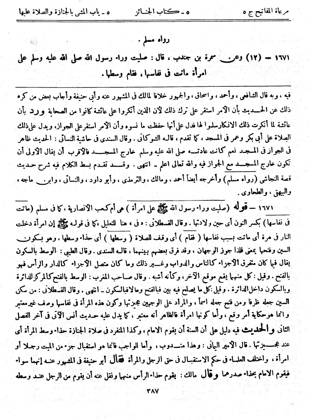 1671- (12) وعن سمرة بن جندب، قال: ((صليت وراء رسول الله - صلى الله عليه وسلم - على امرأة ماتت في نفاسها، فقام وسطها)) .