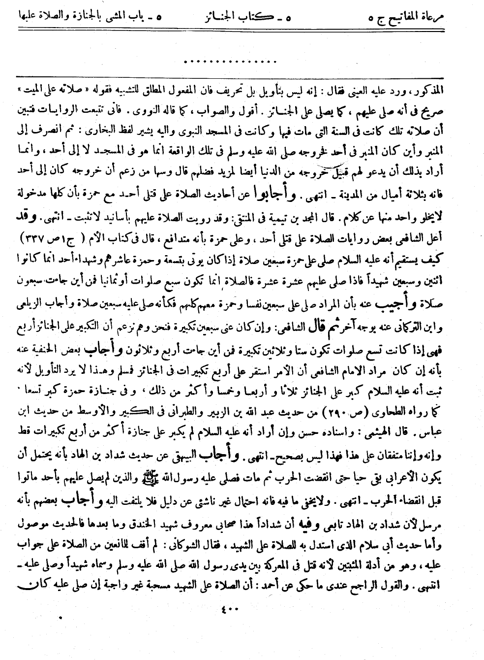المذكور، ورد عليه العيني فقال: إنه ليس بتأويل بل تحريف، فإن المفعول المطلق للتشبيه، فقوله "صلاته على الميت" صريح في أنه صلى عليهم، كما يصلى على الجنائز. أقول والصواب، كما قاله النووي. فإني تتبعت الروايات فتبين أن صلاته كانت في السنة التي مات فيها، وكانت في المسجد النبوي، وإليه يشير لفظ البخاري: ثم انصرف إلى المنبر، وأين كان المنبر في أُحد؟ فخروجه - صلى الله عليه وسلم - في تلك الواقعة إنما هو في المسجد لا إلى أُحد، وإنما أراد بذلك أن يدعوا لهم قبيل خروجه من الدنيا أيضاً لمزيد فضلهم، قال: وسها من زعم أن خروجه كان إلى أحد فإنه بثلاثة أميال عن المدينة-انتهى. وأجابوا عن أحاديث الصلاة على قتلى أحد مع حمزة بأن كلها مدخولة لا يخلو واحد منها عن كلام. قال المجد بن تيمية في المنتقى: وقد رويت الصلاة عليهم بأسانيد لا تثبت-انتهى. وقد أعل الشافعي بعض روايات الصلاة على قتلى أُحد، وعلى حمزة بأنه متدافع، قال في كتاب الأم (ج1ص337) : كيف يستقيم أنه عليه السلام صلى على حمزة سبعين صلاة إذا كان يؤتى بتسعة وحمزة عاشرهم، وشهداء أحد إنما كانوا اثنين وسبعين شهيداً، فإذا صلى عليهم عشرة عشرة فالصلاة إنما تكون سبع صلوات أو ثمانياً، فمن أين جاءت سبعون صلاة؟ وأجيب عنه بأن المراد صلى على سبعين نفساً وحمزة معهم كلهم، فكأنه صلى عليه سبعين صلاة. وأجاب الزيلعي وابن التركماني عنه بوجه آخر. ثم قال الشافعي: وإن كان عني سبعين تكبيرة فنحن وهم نزعم أن التكبير على الجنائز أربع، فهي إذا كانت تسع صلوات تكون ستاً وثلاثين تكبيرة، فمن أين جاءت أربع وثلاثون؟ وأجاب بعض الحنفية عنه بأنه إن كان مراد الإمام الشافعي أن الأمر استقر على أربع تكبيرات في الجنائز فمسلّم، وهذا لا يرد التأويل؛ لأنه ثبت أنه عليه السلام كبر على الجنائز ثلاثاً وأربعاً وخمساً وأكثر من ذلك، وفي جنازة حمزة كبر تسعاً. كما رواه الطحاوي (ص290) من حديث عبد الله بن الزبير والطبراني في الكبير والأوسط من حديث ابن عباس. قال الهيثمي: وإسناده حسن وإن أراد أنه عليه السلام لم يكبر على جنازة أكثر من أربع تكبيرات قط، وإنه وإننا متفقان على هذا فهذا ليس بصحيح-انتهى. وأجاب البيهقي عن حديث شداد بن الهاد بأنه يحتمل أن يكون الأعرابي بقي حياً حتى انقضت الحرب ثم مات، فصلى عليه رسول الله - صلى الله عليه وسلم -، والذين لم يصل عليهم بأُحد ماتوا قبل انقضاء الحرب-انتهى. ولا يخفى ما فيه فإنه احتمال غير ناشىء عن دليل فلا يلتفت إليه. وأجاب بعضهم بأنه مرسل؛ لأن شداد بن الهاد تابعي. وفيه أن شدادا هذا صحابي معروف شهد الخندق وما بعدها، فالحديث موصول. وأما حديث أبي سلام الذي استدل به للصلاة على الشهيد، فقال الشوكاني: لم أقف للمانعين من الصلاة على جواب عليه، وهو من أدلة المثبتين؛ لأنه قتل في المعركة بين يدي رسول الله - صلى الله عليه وسلم - وسماه شهيداً وصلى عليه-انتهى. والقول الراجح عندي ما حكي عن أحمد: أن الصلاة على الشهيد مستحبة غير واجبة، وإن صلى عليه كان