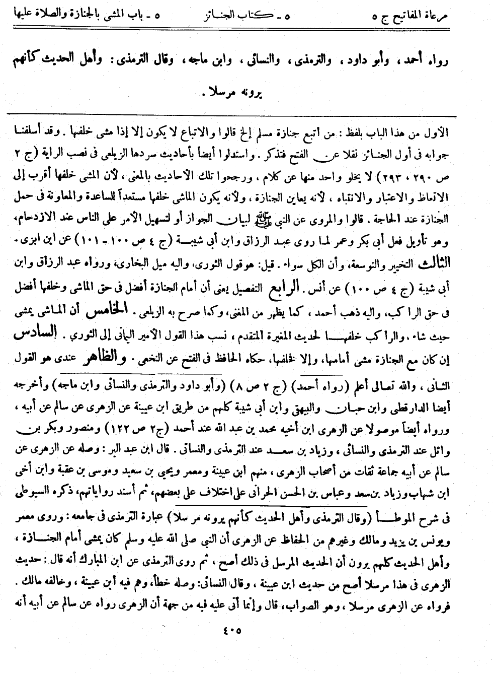 الأول من هذا الباب بلفظ: من اتبع جنازة مسلم الخ. قالوا: والإتباع لا يكون إلا إذا مشى خلفها. وقد أسلفنا جوابه في أول الجنائز نقلاً عن الفتح فتذكر. واستدلوا أيضاً بأحاديث سردها الزيلعي في نصب الراية (ج2: ص290-293) لا يخلوا واحد منها عن كلام، ورجحوا تلك الأحاديث بالمعنى؛ لأن المشي خلفها أقرب إلى الاتعاظ والاعتبار والانتباه؛ لأنه يعاين الجنازة، ولأنه يكون الماشي خلفها مستعداً للمساعدة والمعاونة في حمل الجنازة عند الحاجة. قالوا: والمروي عن النبي - صلى الله عليه وسلم - لبيان الجواز أو لتسهيل الأمر على الناس عند الازدحام، وهو تأويل فعل أبي بكر وعمر لما روى عبد الرزاق وابن أبي شيبة (ج4:ص100-101) عن ابن ابزى. الثالث: التخيير والتوسعة، وأن الكل سواء. قيل: هو قول الثوري، وإليه ميل البخاري، ورواه عبد الرزاق وابن أبي شيبة (ج4:ص100) عن أنس. الرابع: التفصيل يعني أن أمام الجنازة أفضل في حق الماشي وخلفها أفضل في حق الراكب، وإليه ذهب أحمد، كما يظهر من المغني، وكما صرح به الزيلعي. الخامس: أن الماشي يمشي حيث شاء والراكب خلفها لحديث المغيرة المتقدم، نسب هذا القول الأمير اليماني إلى الثوري. السادس: إن كان مع الجنازة مشى أمامها، وإلا فخلفها، حكاه الحافظ في الفتح عن النخعي. والظاهر عندي هو القول الثاني، والله تعالى أعلم. (رواه أحمد) (ج2:ص8) . (وأبوداود والترمذي والنسائي وابن ماجه) وأخرجه أيضاً الدارقطني وابن حبان والبيهقي وابن أبي شيبة كلهم من طريق ابن عيينة عن الزهري عن سالم عن أبيه، ورواه أيضاً موصولاً عن الزهري ابن أخيه محمد بن عبد الله عند أحمد (ج2:ص122) ومنصور وبكر بن وائل عند الترمذي والنسائي، وزياد بن سعد عند الترمذي والنسائي. قال ابن عبد البر: وصله عن الزهري عن سالم عن أبيه جماعة ثقات من أصحاب الزهري، منهم ابن عيينة ومعمر ويحيى بن سعيد وموسى بن عقبة وابن أخي ابن شهاب وزياد بن سعد وعباس بن الحسن الحراني على اختلاف على بعضهم، ثم أسند رواياتهم، ذكره السيوطي في شرح الموطأ. (وقال الترمذي: وأهل الحديث كأنهم يرونه مرسلاً) عبارة الترمذي في جامعه: وروى معمر ويونس بن يزيد ومالك وغيرهم من الحفاظ عن الزهري أن النبي - صلى الله عليه وسلم - كان يمشي أمام الجنازة، وأهل الحديث كلهم يرون أن الحديث المرسل في ذلك أصح، ثم روى الترمذي عن ابن المبارك أنه قال: حديث الزهري في هذا مرسلاً أصح من حديث ابن عيينة، وقال النسائي: وصله خطأ، وهم فيه ابن عيينة، وخالفه مالك. فرواه عن الزهري مرسلاً، وهو الصواب، قال: وإنما أتي عليه فيه من جهة أن الزهري رواه عن سالم عن أبيه أنه