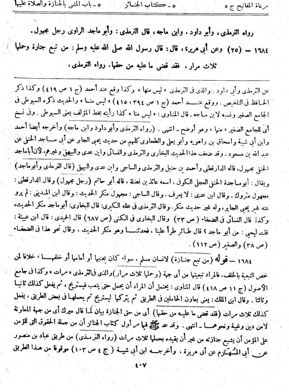 1684- (25) وعن أبي هريرة، قال: قال رسول الله - صلى الله عليه وسلم -: ((من تبع جنازة وحملها ثلاث مرار، فقد قضى ما عليه من حقها)) رواه الترمذي.