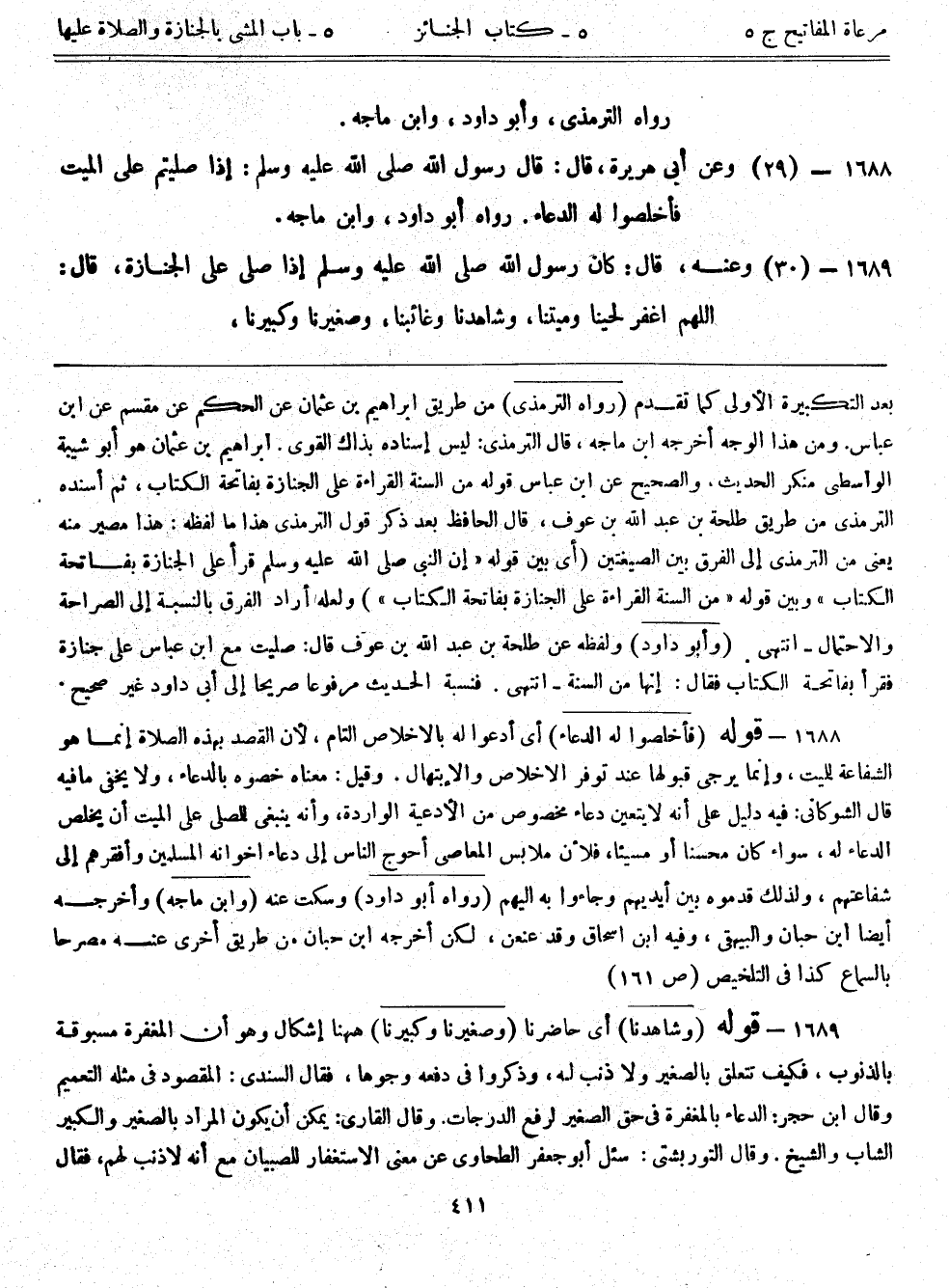 1689- قوله: (وشاهدنا) أي حاضرنا. (وصغيرنا وكبيرنا) ههنا إشكال وهو أن المغفرة مسبوقة بالذنوب، فكيف تتعلق بالصغير ولا ذنب له، وذكروا في دفعه وجوهاً، فقال السندي: المقصود في مثله التعميم. وقال ابن حجر: الدعاء بالمغفرة في حق الصغير لرفع الدرجات. وقال القاري: يمكن أن يكون المراد بالصغير والكبير الشاب والشيخ. وقال التوربشتي: سئل أبوجعفر الطحاوي عن معنى الاستغفار للصبيان مع أنه لا ذنب لهم، فقال