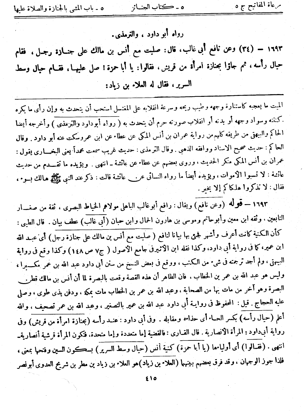 1693- قوله: (وعن نافع) ويقال: رافع أبوغالب الباهلي مولاهم الخياط البصري، ثقة من صغار التابعين، وثقة ابن معين وأبوحاتم وموسى بن هارون الحمال وابن حبان. (أبي غالب) عطف بيان. قال الطيبي: كأن الكنية كانت أعرف وأشهر فجيء بها بياناً لنافع. (صليت مع أنس بن مالك على جنازة رجل) أي عبد الله بن عمير، كما في رواية أبي داود، وكذا نقله ابن الأثير في جامع الأصول (ج7:ص148) ، وكذا وقع في رواية البيهقي، ولم أجد ترجمته في شيء من الكتب، ووقع في بعض النسخ من سنن أبي داود: عبد الله بن عمر مكبراً، وليس هو عبد الله بن عمر بن الخطاب، فإن الظاهر أن هذه القصة وقعت بالبصرة لما أن أنس بن مالك قطن البصرة، وهو آخر من مات بها من الصحابة، وعبد الله بن عمر بن الخطاب مات بمكة، ودفن بذي طوى، وصلى عليه الحجاج. قيل: المحفوظ في رواية أبي داود: عبد الله بن عمير بالتصغير، وعبد الله بن عمر تصحيف، والله أعلم. (حيال رأسه) بكسر الحاء أي حذاءه ومقابله. وفي أبي داود: عند رأسه. (بجنازة امرأة من قريش) وفي رواية أبي داود: المرأة الأنصارية. قال القاري: فالقضية إما متعددة وإما متحدة، فتكون المرأة قرشية أنصارية-انتهى. (فقالوا) أي أولياؤها: (يا أبا حمزة) كنية أنس. (حيال وسط السرير) بسكون السين وفتحها بمعنى، فلذا جوز الوجهان، وقد فرق بعضهم بينهما. (العلاء بن زياد) هو العلاء بن زياد بن مطر بن شريح العدوي أبونصر
