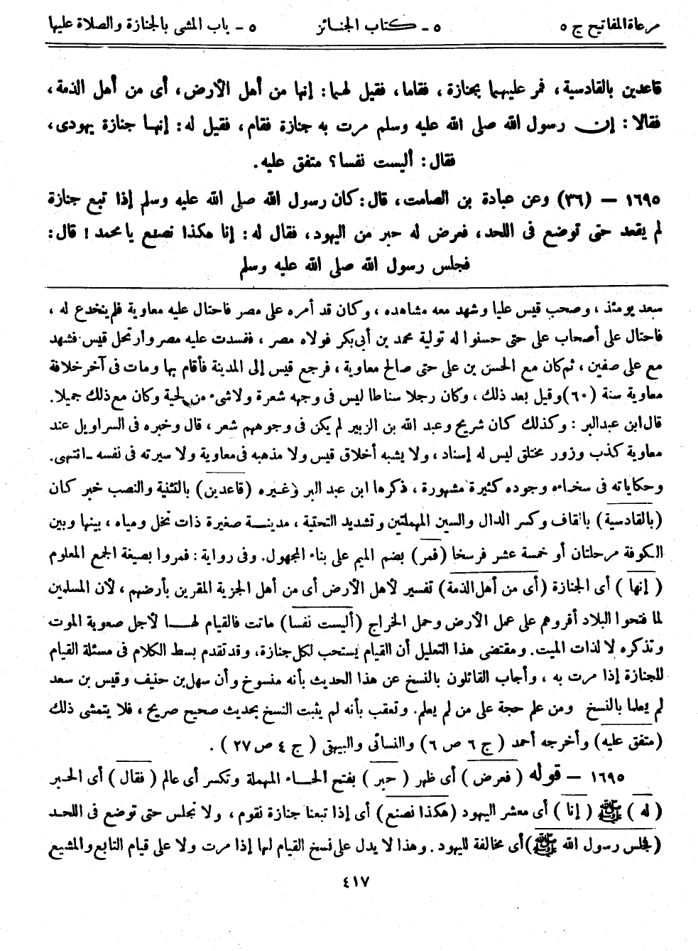 سعد يومئذٍ، وصحب قيس علياً وشهد معه مشاهده، وكان قد أمره علي مصر فاحتال عليه معاوية فلم ينخدع له، فاحتال على أصحاب علي حتى حسنوا له تولية محمد بن أبي بكر فولاه مصر، ففسدت عليه مصر، وارتحل قيس فشهد مع علي صفين، ثم كان مع الحسن بن علي حتى صالح معاوية، فرجع قيس إلى المدينة فأقام بها ومات في آخر خلافة معاوية سنة (60) وقيل بعد ذلك، وكان رجلاً سناطاً، ليس في وجهه شعرة ولا شيء من لحية وكان مع ذلك جميلا. ً قال ابن عبد البر: وكذلك كان شريح وعبد الله بن الزبير لم يكن في وجوههم شعر، قال: وخبره في السراويل عند معاوية كذب وزور مختلق ليس له إسناد، ولا يشبه أخلاق قيس ولا مذهبه في معاوية ولا سيرته في نفسه-انتهى. وحكاياته في سخاء وجوده كثيرة مشهورة، ذكرها ابن عبد البر وغيره. (قاعدين) بالتثنية والنصب خبر كان. (بالقادسية) بالقاف وكسر الدال والسين المهملتين وتشديد التحتية، مدينة صغيرة ذات نخل ومياه، بينها وبين الكوفة مرحلتان أو خمسة عشر فرسخاً. (فمر) بضم الميم على بناء المجهول. وفي رواية: فمروا بصيغة الجمع المعلوم. (إنها) أي الجنازة. (أي من أهل المدينة) تفسير لأهل الأرض أي من أهل الجزية المقرين بأرضهم؛ لأن المسلمين لما فتحوا البلاد أقروهم على عمل الأرض وحمل الخراج. (أليست نفساً) ماتت فالقيام لها لأجل صعوبة الموت وتذكره لا لذات الميت. ومقتضى هذا التعليل أن القيام يستحب لكل جنازة، وقد تقدم بسط الكلام في مسألة القيام للجنازة إذا مرت به، وأجاب القائلون بالنسخ عن هذا الحديث بأنه منسوخ، وأن سهل بن حنيف وقيس بن سعد لم يعلما بالنسخ، ومن علم حجة على من لم يعلم. وتعقب بأنه لم يثبت النسخ بحديث صحيح صريح، فلا يتمشى ذلك. (متفق عليه) وأخرجه أحمد (ج6:ص6) والنسائي والبيهقي (ج4:ص27) .