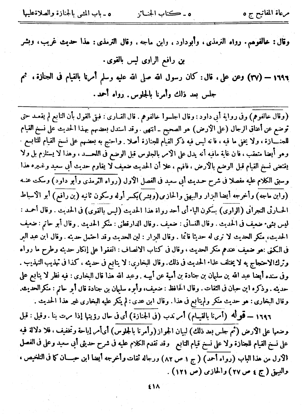 1696- (37) وعن علي، قال: ((كان رسول الله - صلى الله عليه وسلم - أمرنا بالقيام في الجنازة، ثم جلس بعد ذلك وأمرنا بالجلوس) رواه أحمد.