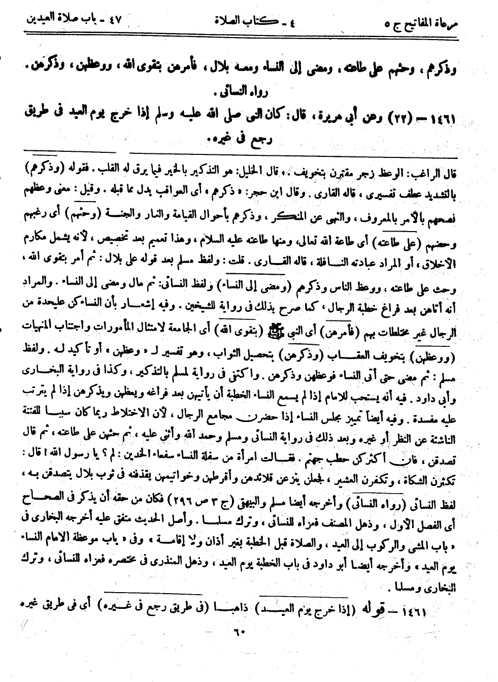 1461- (22) وعن أبي هريرة قال: كان النبي - صلى الله عليه وسلم - إذا خرج يوم العيد في طريق رجع في غيره.