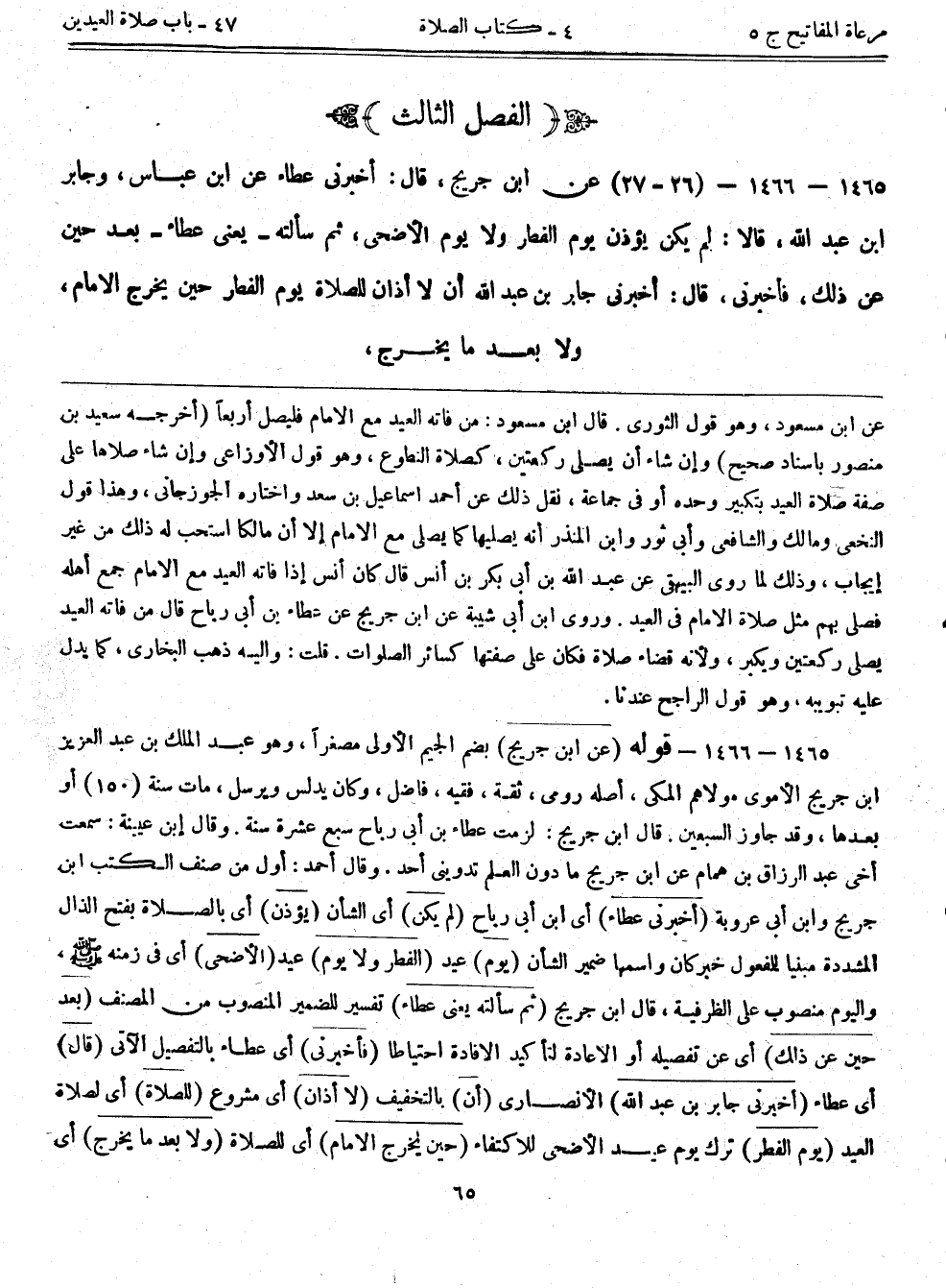 1465-1466- (26-27) عن ابن جريج قال: أخبرني عطاء عن ابن عباس، وجابر بن عبد الله قالا: لم يكن يؤذن يوم الفطر ولا يوم الأضحى، ثم سألته – يعني عطاء – بعد حين عن ذلك، فأخبرني قال: أخبرني جابر بن عبد الله أن لا أذان للصلاة يوم الفطر حين يخرج الإمام، ولا بعد ما يخرج،
